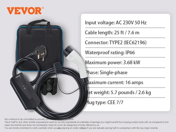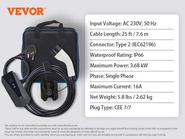 Portable Type 2 EV Charger 16A 3.68kW 25ft Cable