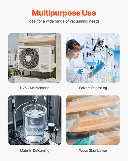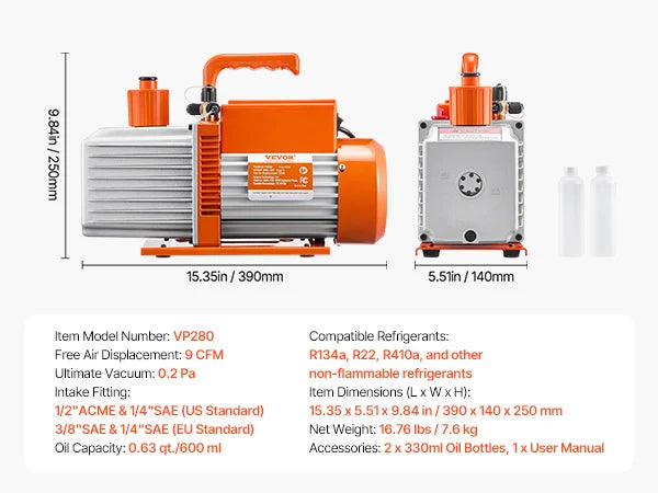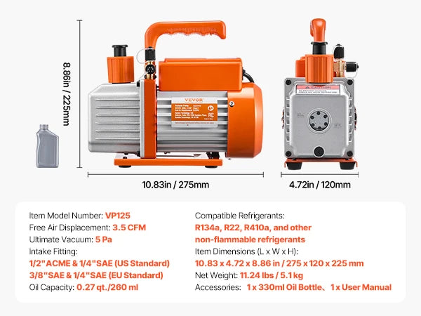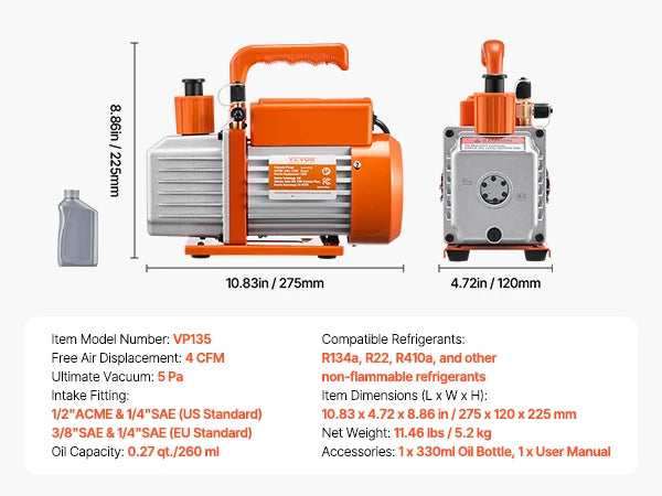 To keep the pump in peak condition, monitor oil levels and quality regularly and refill with the included or recommended oil when needed. The unit comes with a 0.35 qt vacuum oil bottle and is designed to be compatible with standard 100# vacuum pump oil (kinematic viscosity around 46) as part of routine maintenance. This AC vacuum pump is ideal for servicing home HVAC systems, repairing car cooling systems, or handling small-scale industrial applications.
