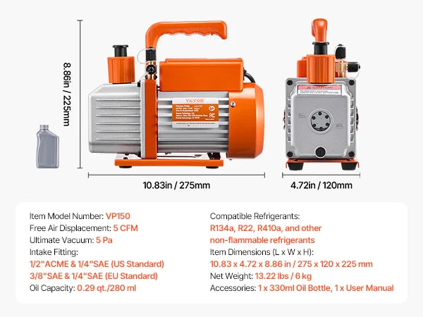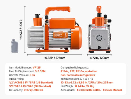 Meet the Vacuum Pump and Oil Bottle with R134a R22 R410a, a versatile HVAC service tool designed for professional technicians and serious DIYers. This pump family delivers fast evacuation across 3.5 CFM to 9 CFM, with options for single-stage (ultimate vacuum to 5 Pa) or double-stage rotary vane operation (ultimate vacuum to 0.2 Pa) to match your workload. It supports R134a, R22, R410a and other non-flammable refrigerants and includes both EU and US intake fittings for broad compatibility.