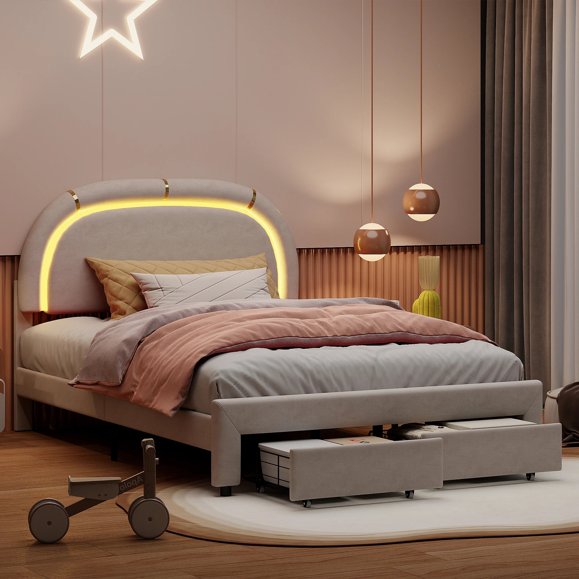 The Upholstery Bed 140x200 CM with 2 Drawers in Velvet Beige from UrbanLuxe brings a refined, minimalist touch to any modern bedroom. Wrapped in elegant beige velvet fabric, it offers a soft, skin-friendly surface that adds warmth and texture to your space. The bed features two hidden drawers for practical storage, helping you keep seasonal clothing, bed linens, and accessories neatly under the bed while preserving a clean, uncluttered look.