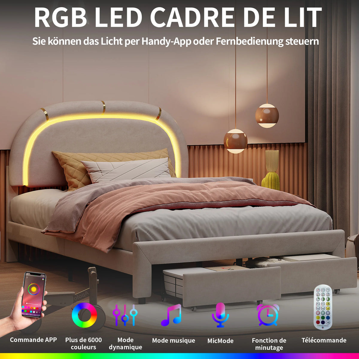 - Upholstered bed frame with two large hidden drawers embedded in the bed frame