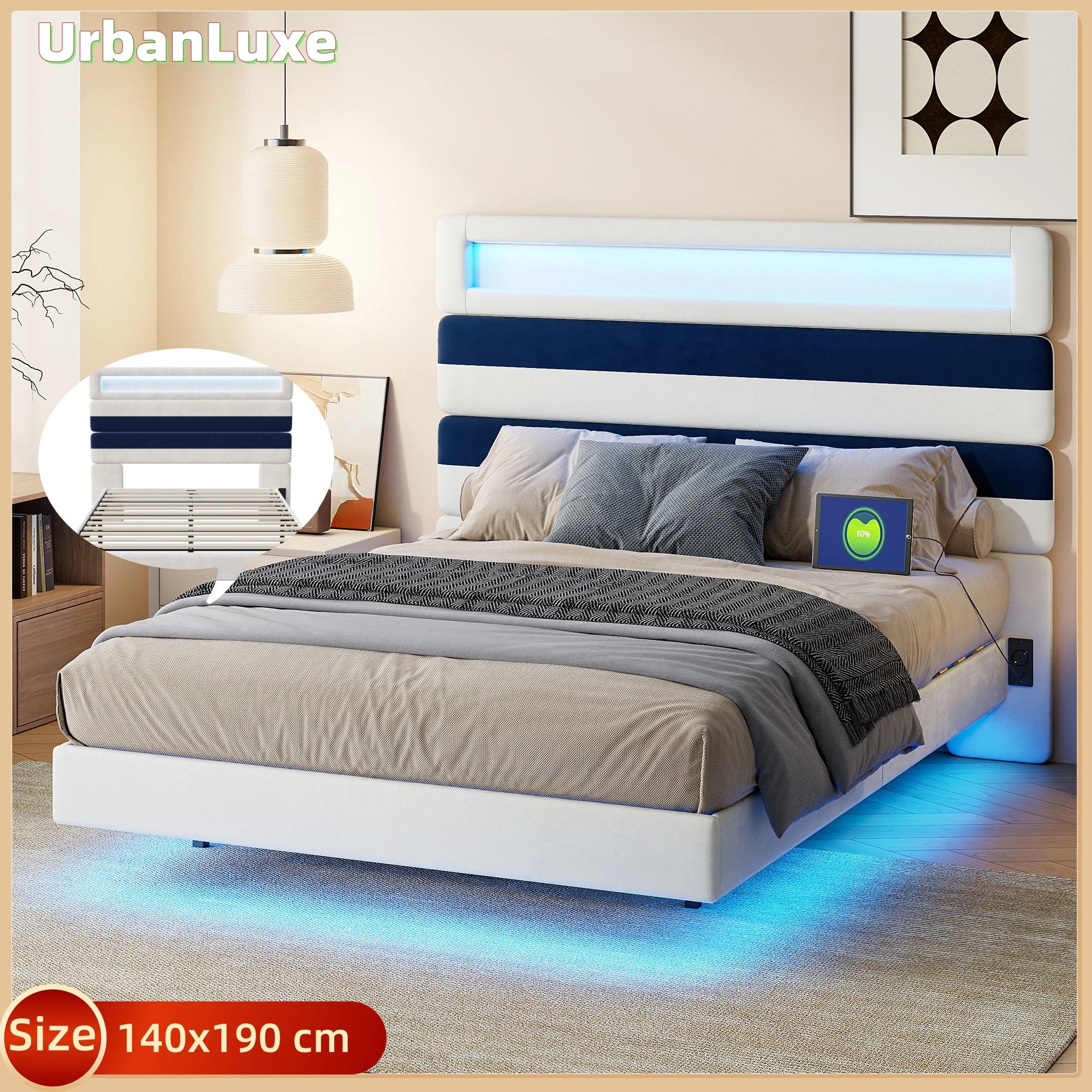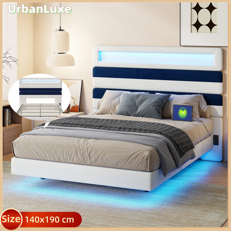 Introducing the Urban Luxe Velvet Bed 140x190 Slatted Frame LED USB — a refined fusion of plush comfort, contemporary design, and modern convenience. Draped in cream and blue velvet with stripe-inspired detailing, this bed brings a sophisticated texture to any bedroom while delivering practical features that simplify your nightly routine.