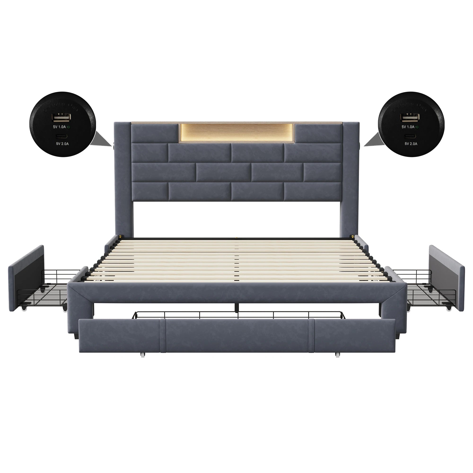Urban Luxe Bed Rack 140x200 With Drawers And LED Gray Velvet