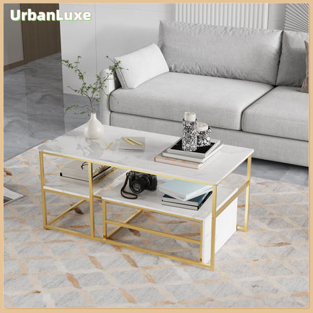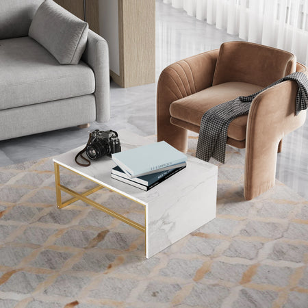 Elevate your living room with the Urban Luxe White Marble Slab Coffee Table featuring stunning Gold Legs. This 105 cm rectangular coffee table blends a pristine white marble top with glamorous gold-toned metal legs, delivering a refined centerpiece that suits minimalist modern spaces and Modern Morocco aesthetics alike. The rounded corner design adds a touch of safety for busy family homes, while a robust metal frame ensures long-lasting stability. With double storage, you get an upper surface for cups and remotes and a lower open shelf for magazines and décor, keeping your living area neat and inviting. Its versatile size and elegant finish make it easy to integrate with a range of decor styles, turning everyday moments into a stylish experience.