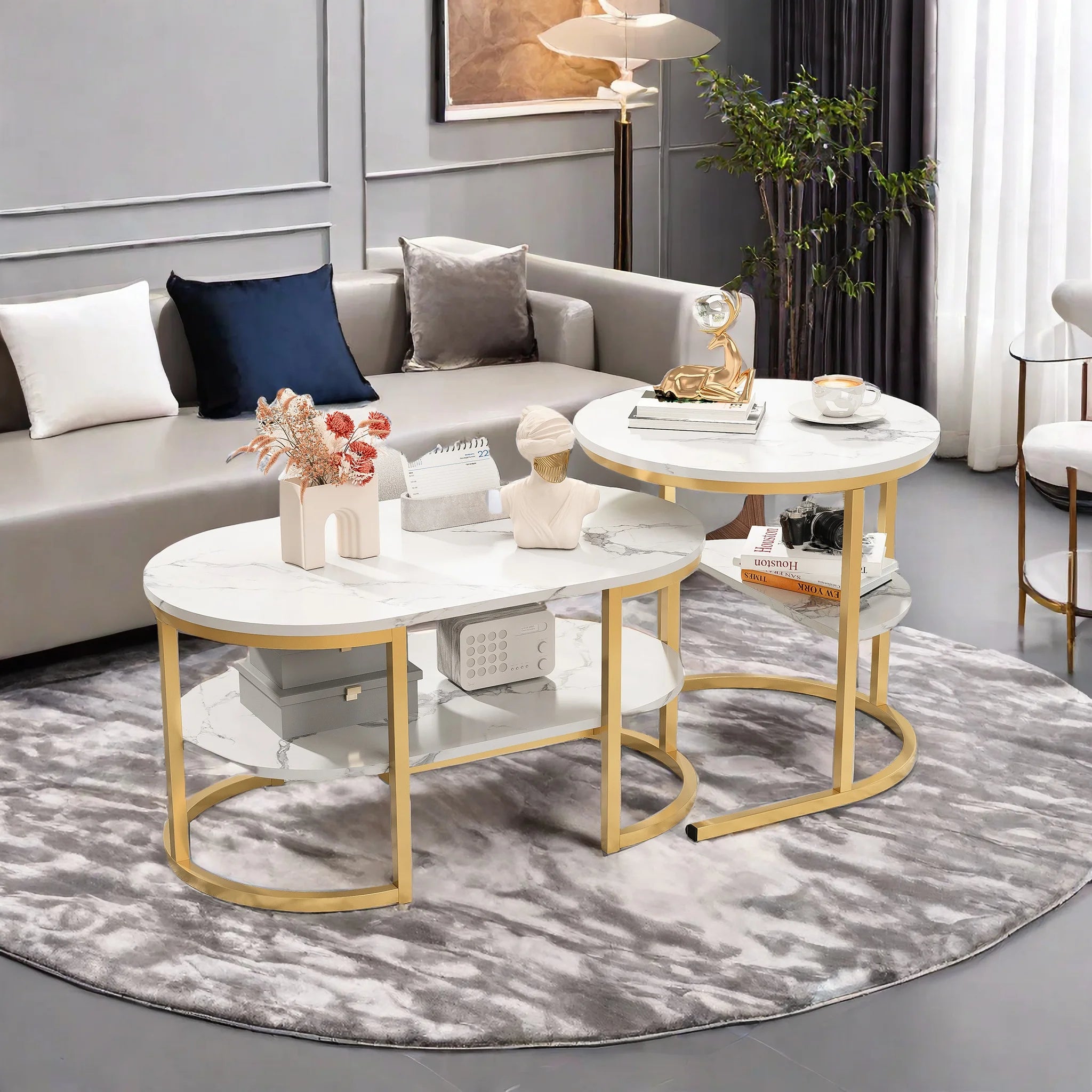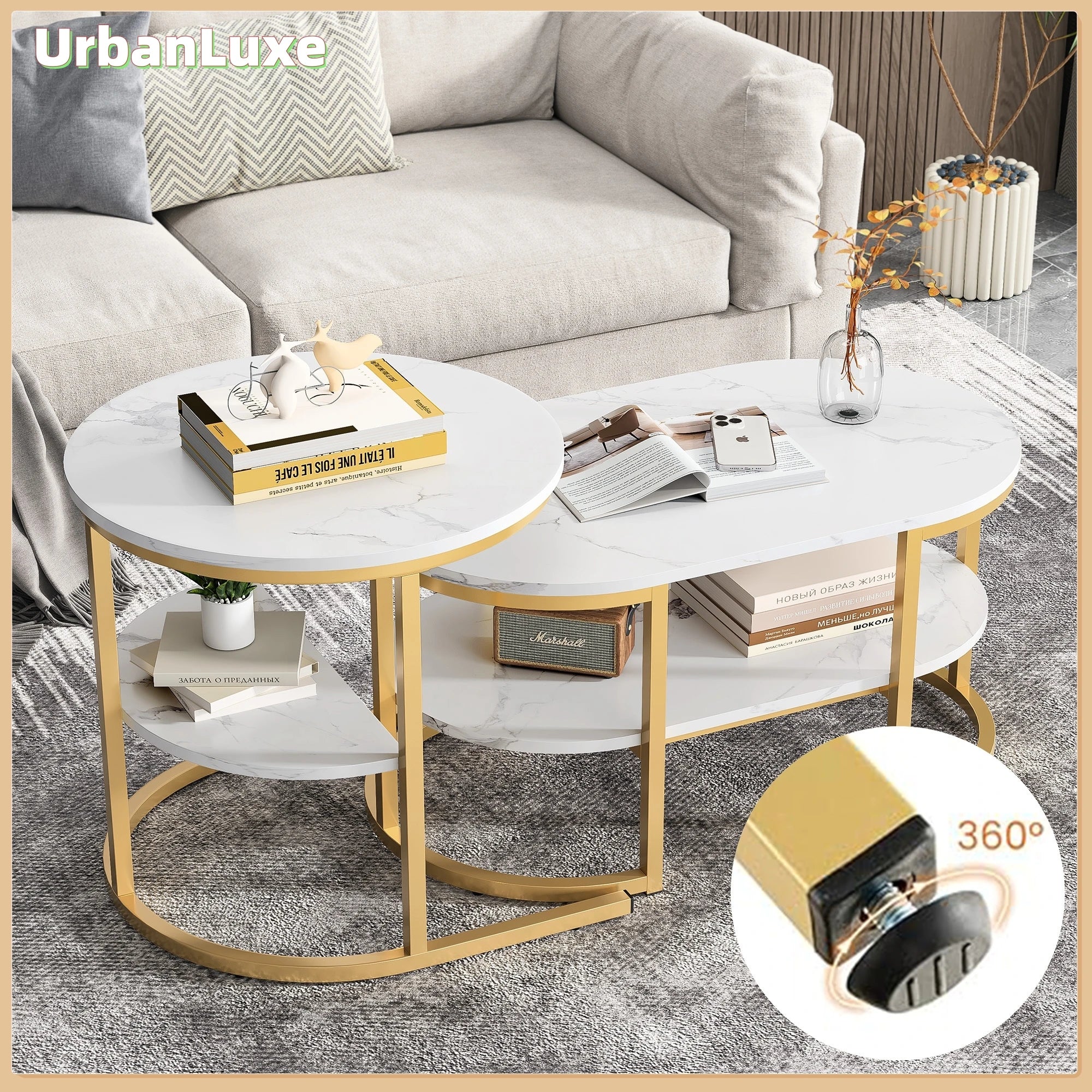 Designed for everyday life, the table features adjustable feet to keep it stable on uneven floors, so you and your guests can relax without wobble. The smooth marble surface is not only visually striking but also easy to wipe clean, making daily use a breeze. A sturdy metal edge helps protect the surface from spills and daily bumps while adding a touch of industrial-chic charm. The interior storage space provides a practical spot for magazines, remotes, and small items, helping your living room stay neat and organized. With its versatile oval shape, it works as the main coffee table or as a convenient side table beside a sofa—perfect for tea, conversations, and everyday gatherings.