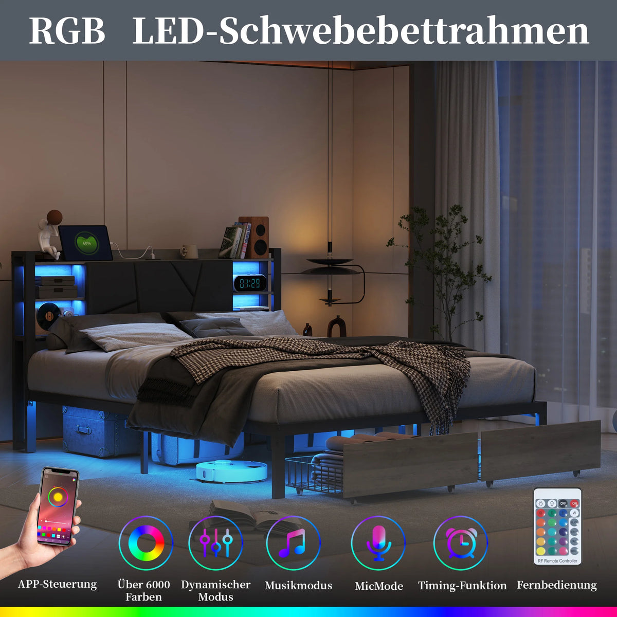 Urban Luxe 160x200 Double Bed 2 Drawers Led Lights Black