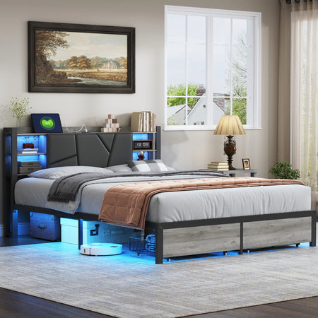 The double-control headboard stores a built-in plate and features a LED light band that can be controlled by remote or via a mobile app to create the perfect mood for reading, winding down, or late-night chats. The soft PU backrest adds comfort, while the two large drawers behind the bed provide ample space for bedding, clothes, and personal items, helping your bedroom stay neat and organized.