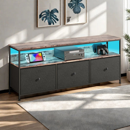 Upgrade your living room with the Urban Luxe TV Wardrobe with LED Light Bar and 3 Drawers. This modern, multi-style media cabinet blends Scandinavian and Moroccan influences to create a striking focal point that complements a range of interior designs. A tiger leather panel paired with warm black cloth sets a sophisticated, contemporary mood, while a robust iron frame delivers lasting stability for your TV and media setup. The desk-grade E1 chipboard keeps materials eco-friendly and durable for everyday use.