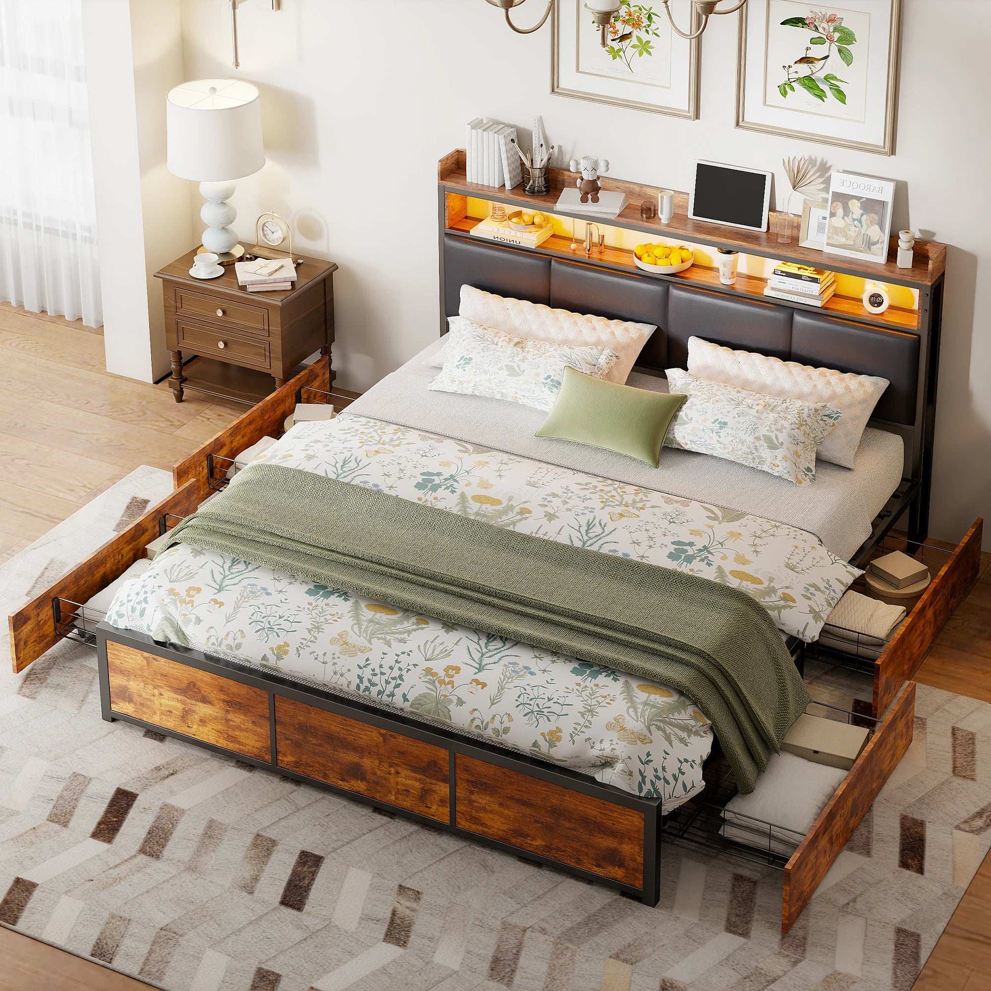 Storage is intelligently designed with four deep drawers—located on the sides or at the foot—so you can neatly sort clothes, bed linens, and other essentials. Quiet sliding rails ensure smooth, silent operation, keeping your bedroom tidy and organized with ease.