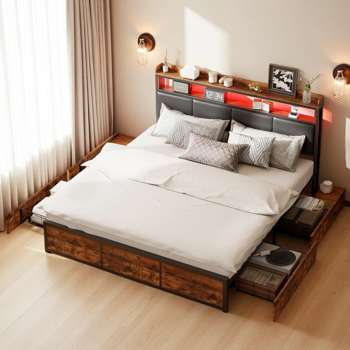 - LED features: Hidden LED light strips in headboard, adjustable brightness