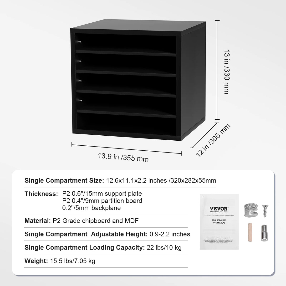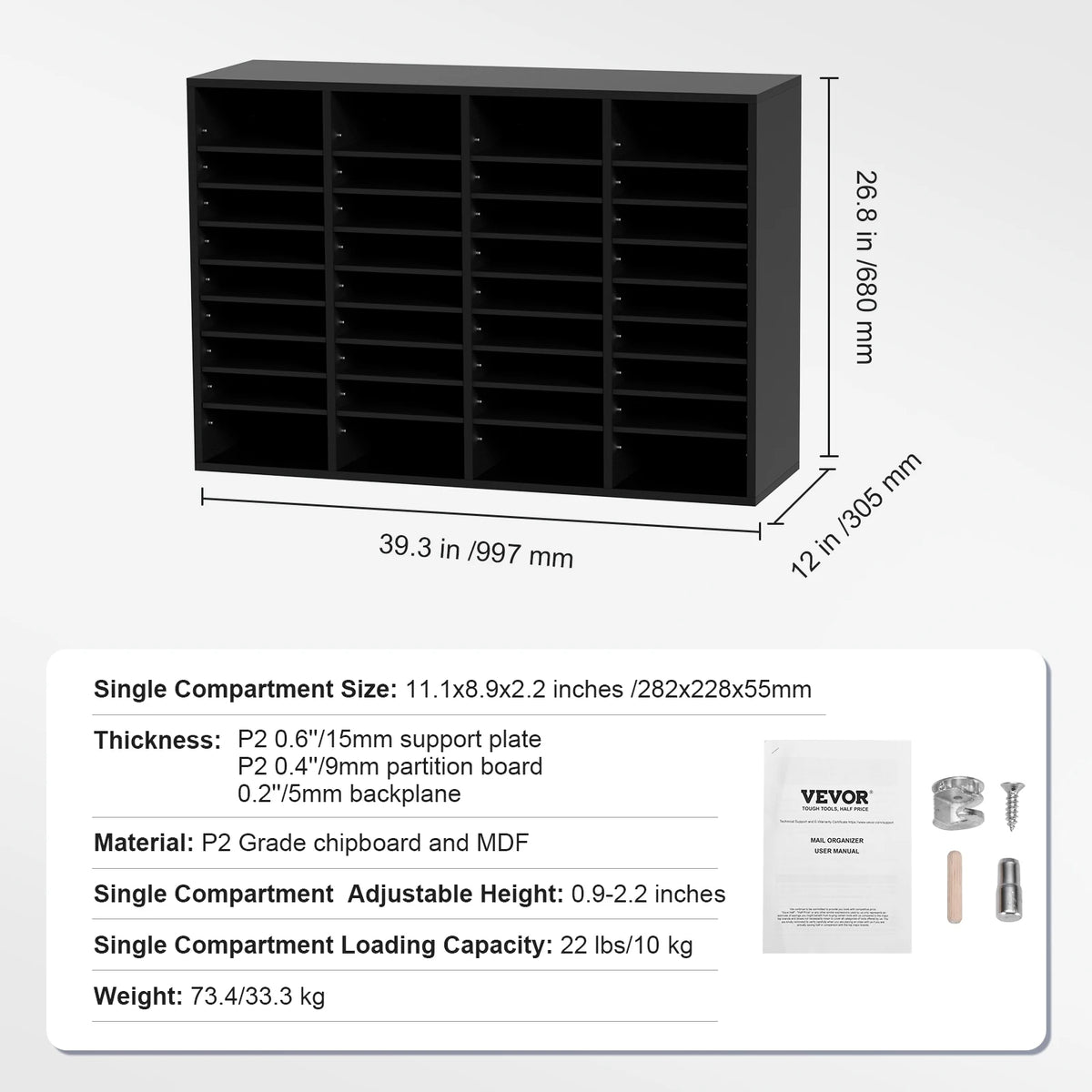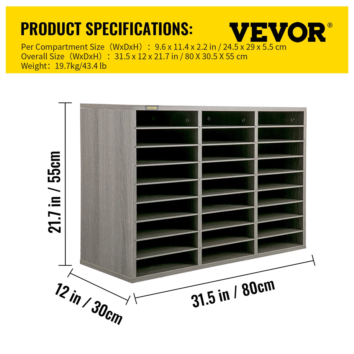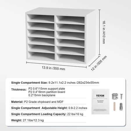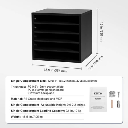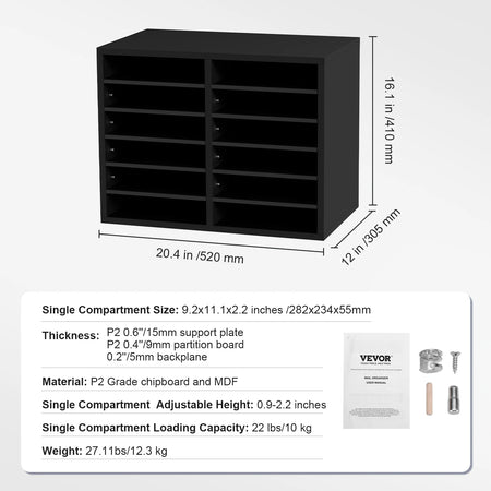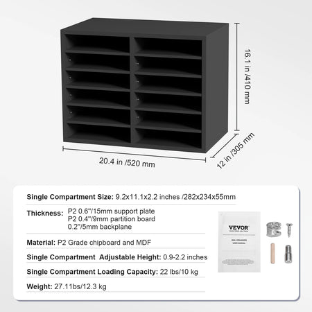 Organize your workspace with the VEVOR Wood Literature Organizer, a versatile solution designed to keep magazines, documents, and books neatly arranged. Available in 5, 12, 24, and 36-compartment configurations, this sturdy organizer scales to fit your space and needs. Constructed from P2 Grade chipboard and MDF, it delivers reliable durability for daily use while the adjustable shelves let you tailor each compartment from 0.9 to 2.2 inches tall to accommodate different sizes. Each compartment supports up to 22 lbs (10 kg), so you can store folders, catalogs, and mail without worry. Originating from Mainland China, this VEVOR organizer blends practical design with dependable materials for a clutter-free desk, shelf, or classroom.
