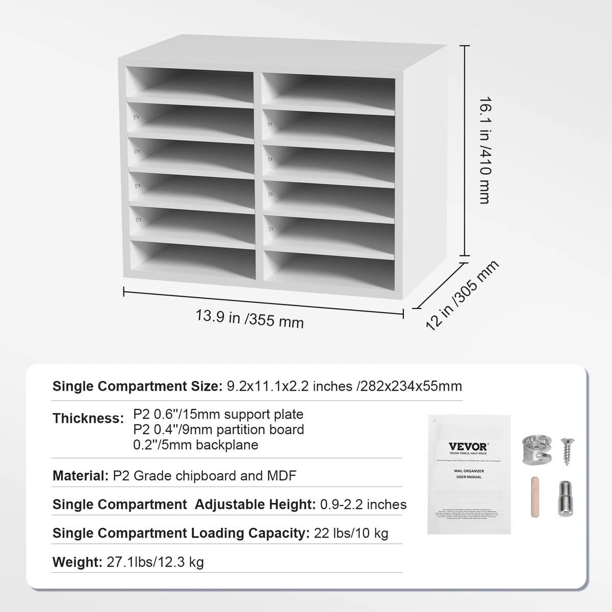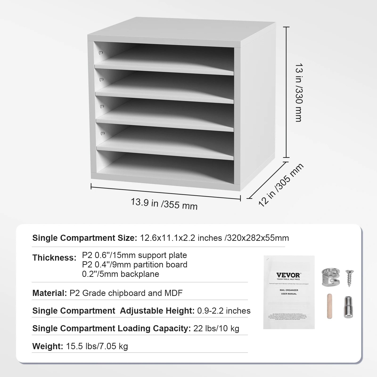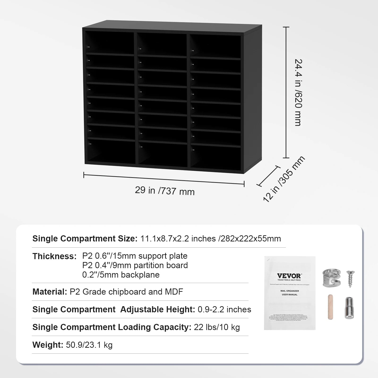 Organize your workspace with the VEVOR Wood Literature Organizer, a versatile solution designed to keep magazines, documents, and books neatly arranged. Available in 5, 12, 24, and 36-compartment configurations, this sturdy organizer scales to fit your space and needs. Constructed from P2 Grade chipboard and MDF, it delivers reliable durability for daily use while the adjustable shelves let you tailor each compartment from 0.9 to 2.2 inches tall to accommodate different sizes. Each compartment supports up to 22 lbs (10 kg), so you can store folders, catalogs, and mail without worry. Originating from Mainland China, this VEVOR organizer blends practical design with dependable materials for a clutter-free desk, shelf, or classroom.