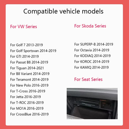 To ensure compatibility with your specific VW model, the installer can determine suitability by sharing photos of your car’s center console and glove box with our support team.