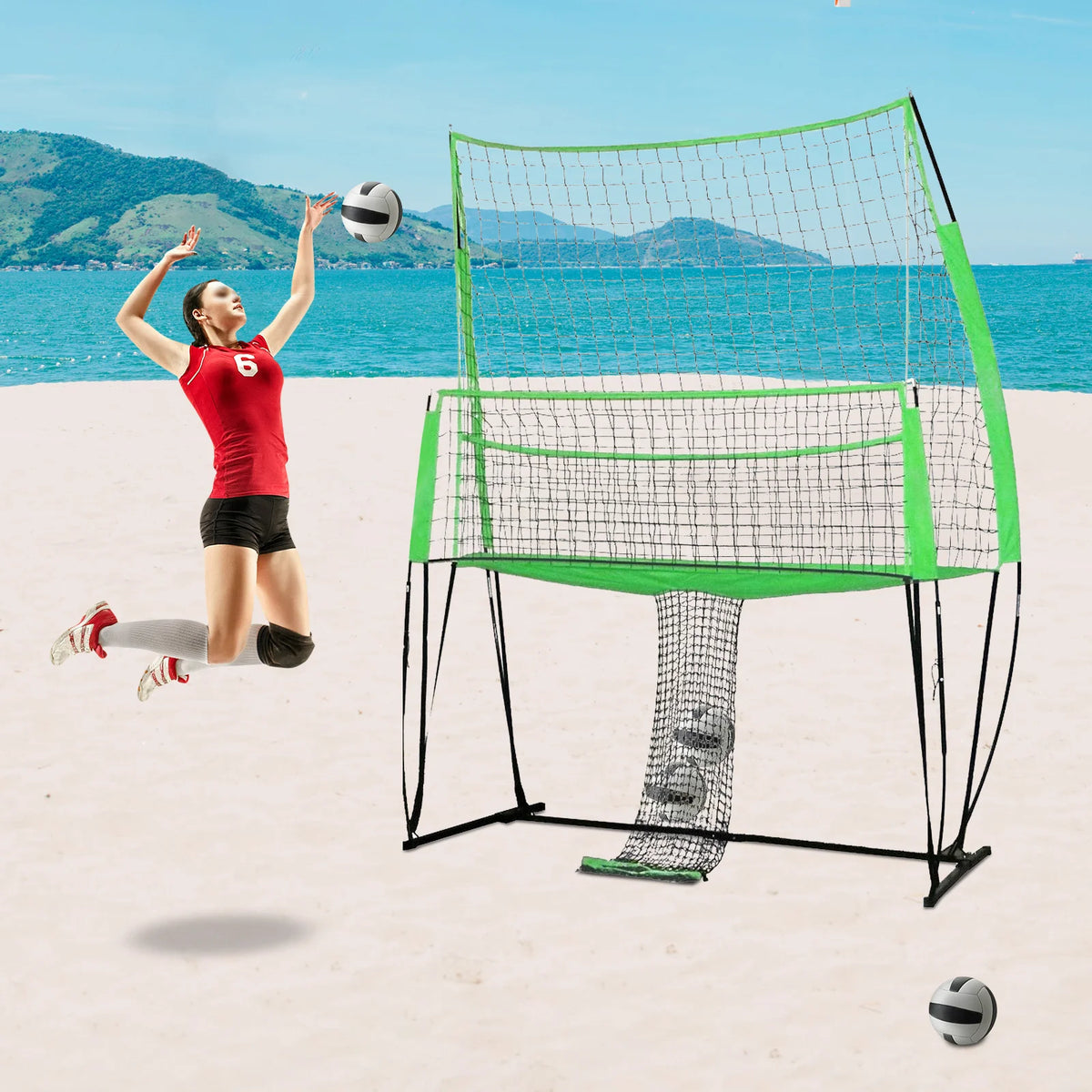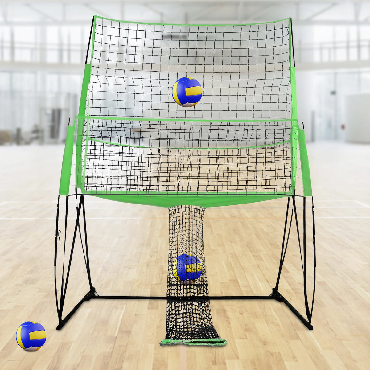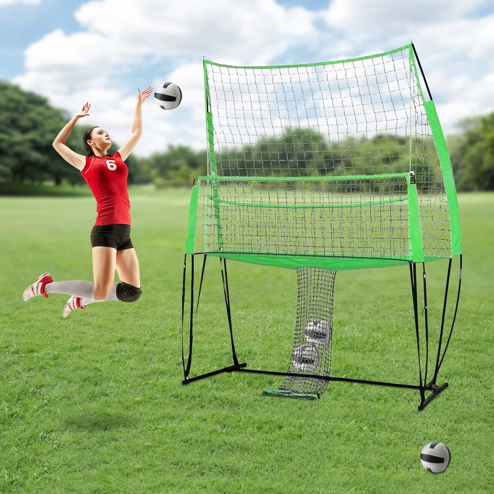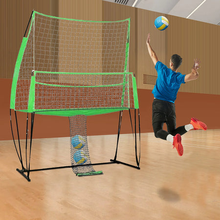 Rede de treino de voleibol leve, forte e versátil, projetada para uso em casa, ginásio, escola ou parque infantil. Tamanho 2.44 x 3.35 m com uma malha de nylon durável e acabamento verde para fácil visibilidade durante a prática.