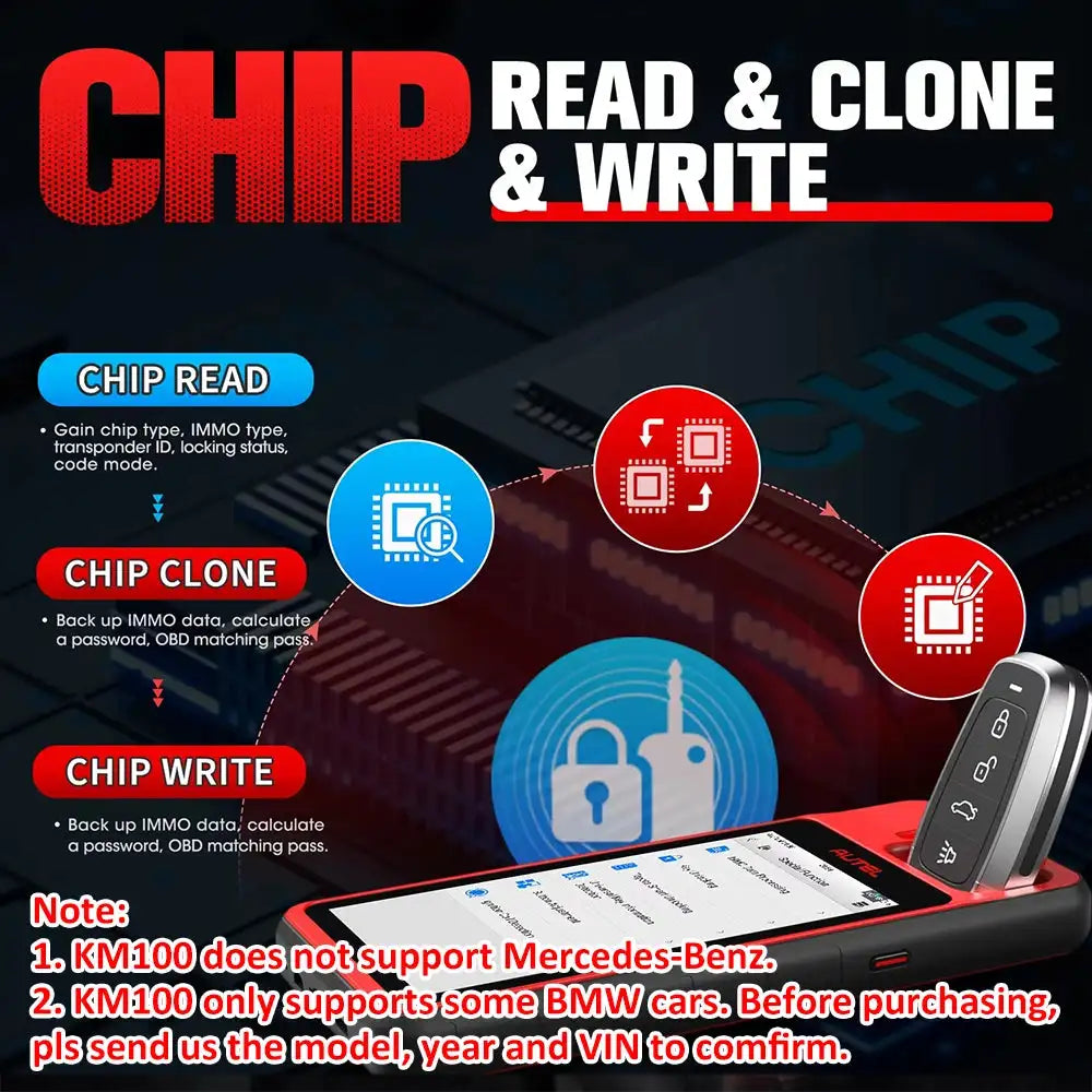 Autel MaxiIM KM100X — uma ferramenta de programação de chaves e imobilizador OBD rápida e portátil, projetada para técnicos e chaveiros que precisam de geração de chaves fiável em 60s e funções IMMO no veículo.