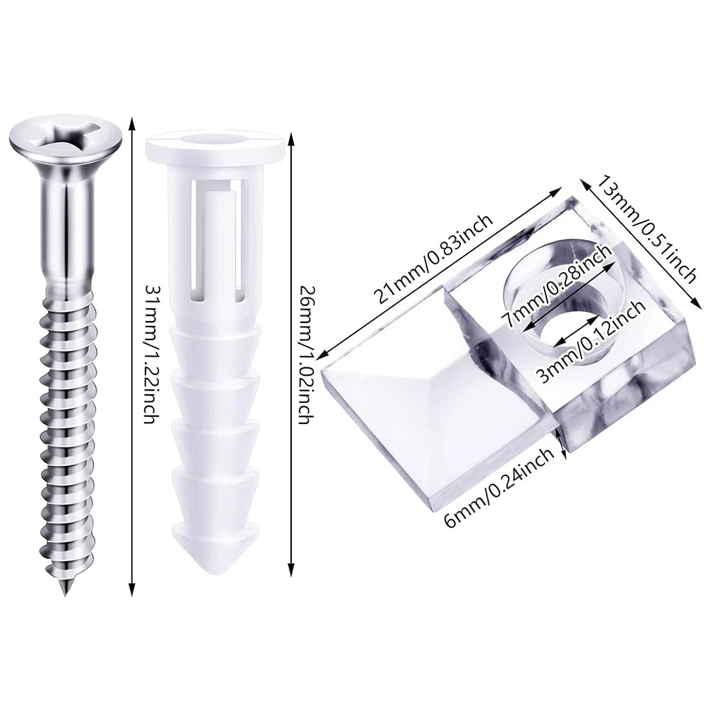 Os clips suportes são feitos de plástico ABS durável, leve mas resistente à quebra, e os parafusos metálicos incluídos proporcionam fixação fiável. A cor transparente combina com a maioria dos decorações, mantendo o material discreto enquanto preserva uma aparência limpa e contínua. Cada clip mede aproximadamente 21 mm (0,83 polegadas) de comprimento e é adequado para instalar vidro com cerca de 1/4 de polegada de espessura. Por favor, consulte as imagens do produto para referências precisas de tamanho.