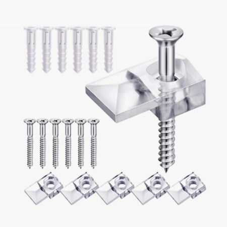 Fácil de instalar — basta perfurar furos devidamente espaçados, fixar os clips e apertar os parafusos para uma fixação firme. Este kit é ideal para montar espelhos em portas de armários, fixar painéis de vidro em portas sem moldura ou adicionar detalhes leves de vidro a paredes e móveis.