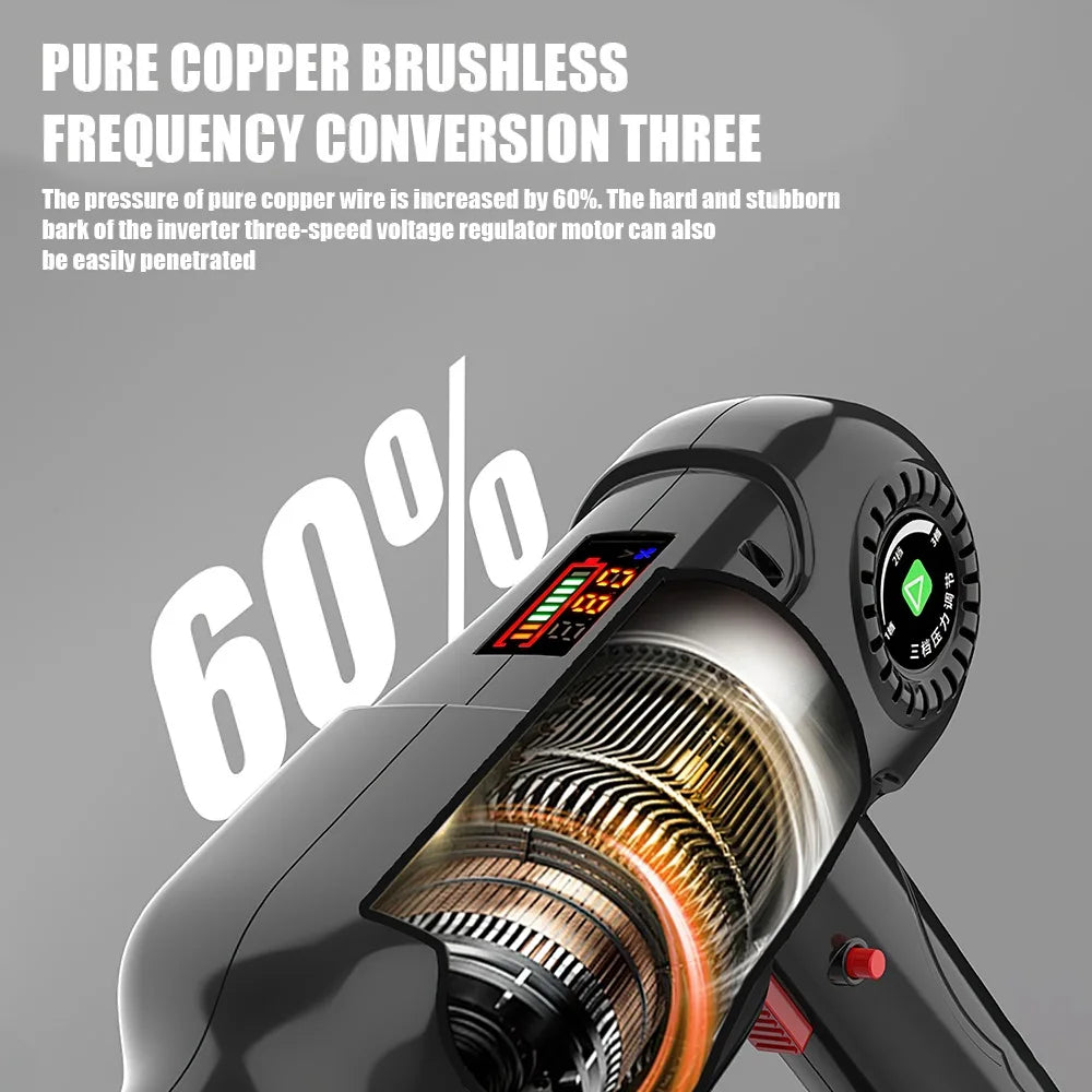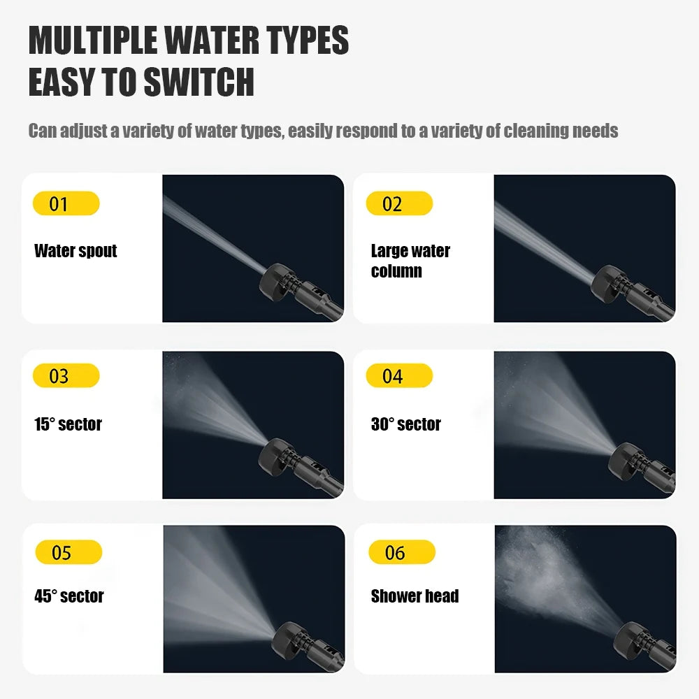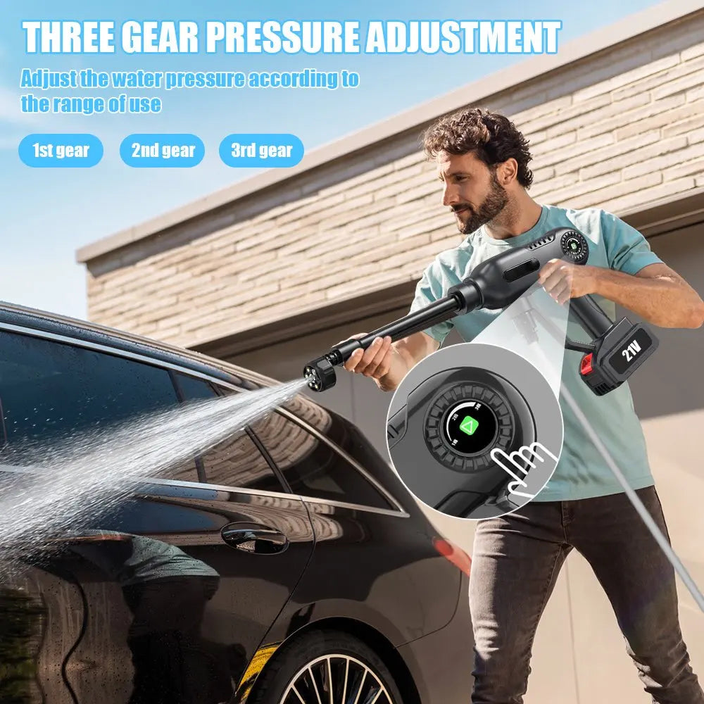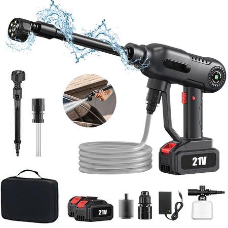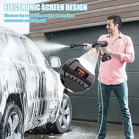 Experimente o poder de limpeza sem fios com a Pistola de Lavagem de Alta Pressão Brushless 30Bar com 3 Velocidades da DWiusty. Este lavador compacto, alimentado a bateria, fornece até 30 bar de água em alta pressão e 6 litros por minuto, facilitando a remoção rápida de sujidade em carros, motociclos, bicicletas, pátios e equipamentos exteriores. O segredo está no motor brushless de cobre puro, que aumenta a pressão em até 60% comparado com modelos tradicionais, funcionando de forma mais fria e eficiente. Um ecrã digital incorporado permite monitorizar a vida útil da bateria de relance, para saber quando recarregar. Com três velocidades, pode ajustar a pressão perfeita para cada tarefa — desde um enxaguamento suave até uma limpeza profunda e potente. O bocal seis em um oferece seis padrões de pulverização num só bocal, e o frasco de espuma integrado cria uma espuma rica e densa que ajuda a espalhar o detergente uniformemente e a poupar líquido de lavagem de carros.