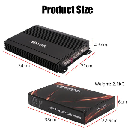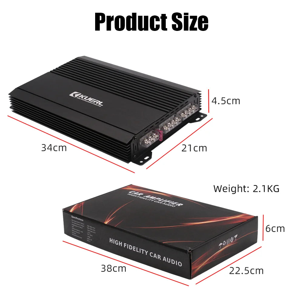 Upgrade your car audio with the KUERL 4-Channel Car Amplifier. This 12V bridgeable amp delivers 4x45W of clean, dynamic power for precise highs, punchy mids, and tight bass. Its durable aluminum alloy chassis provides robust heat dissipation, helping you maintain performance even during long listening sessions. Designed to drive 2/4-ohm speakers, it adapts to your system for optimal efficiency and compatibility. The wide frequency response of 10 Hz to 30 kHz and a signal-to-noise ratio over 90 dB ensure rich, detailed sound with minimal hiss or distortion.