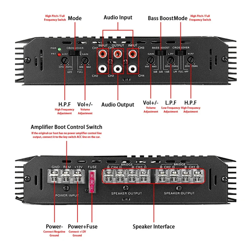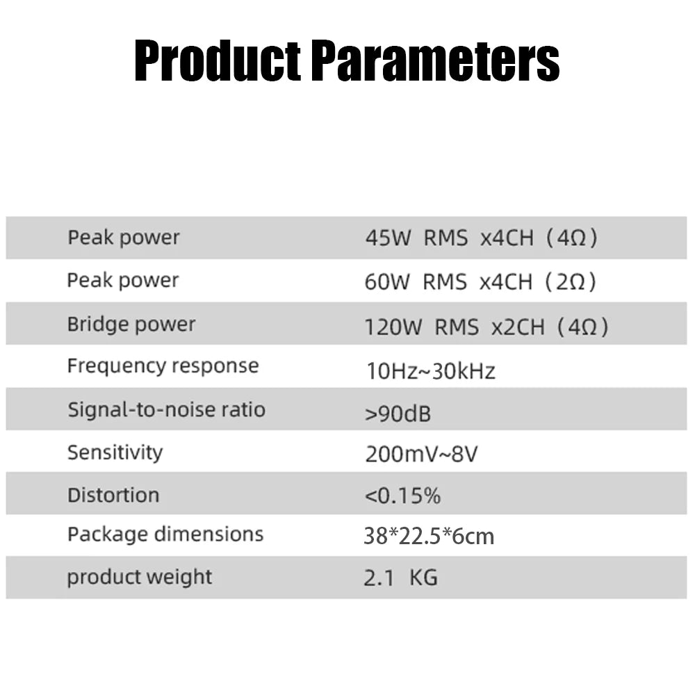 - Output Power: 4 x 45W (Bridgeable) at 12V