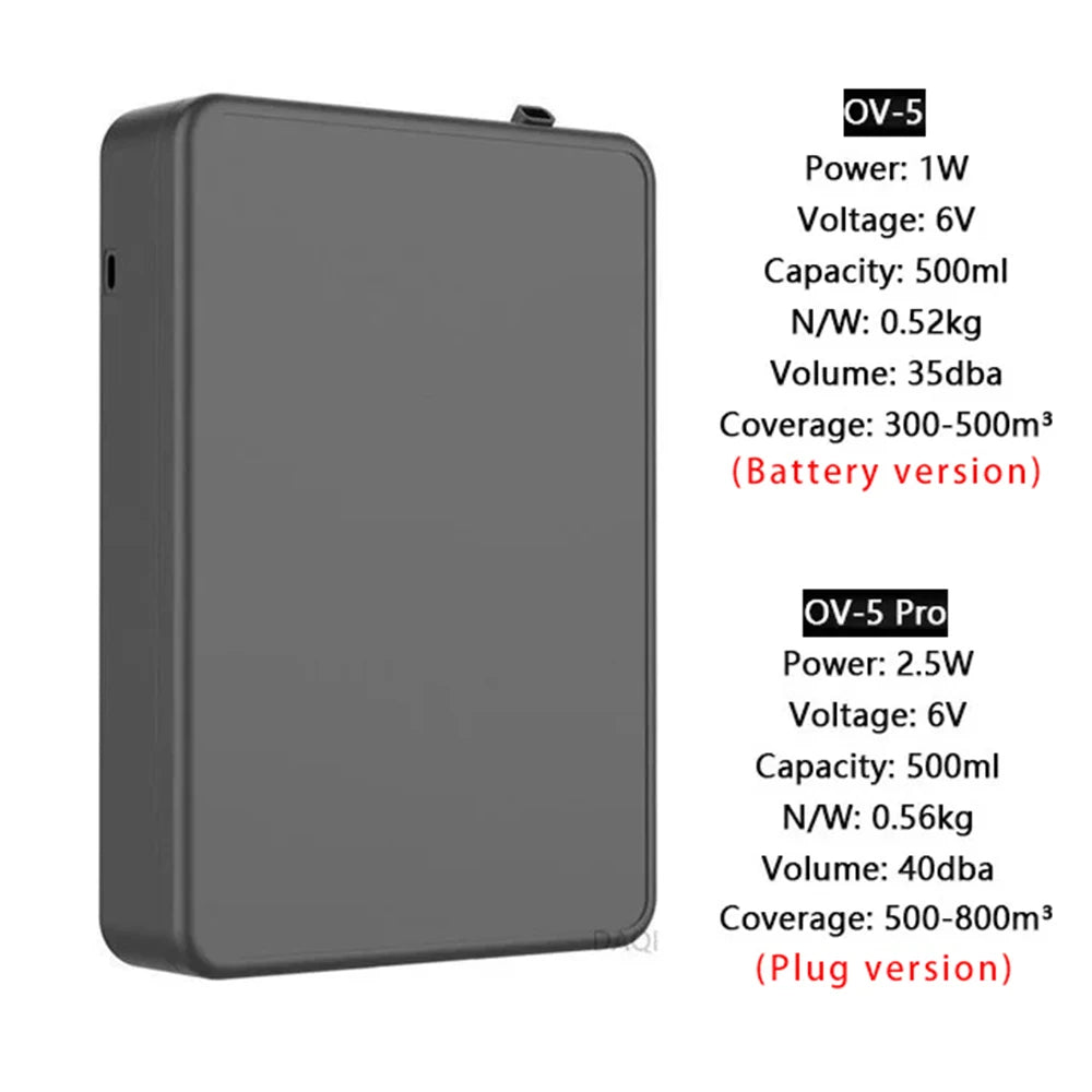 Nosso difusor de última geração opera sem água, utilizando óleos essenciais solúveis em óleo com concentrações variando de 5% a 60%. Isso garante um aroma potente que transforma seu ambiente em um refúgio de tranquilidade. Escolha entre duas versões: o OV-5 Pro, que inclui um plugue e cabo USB, ou a versão OV-5, que vem sem.