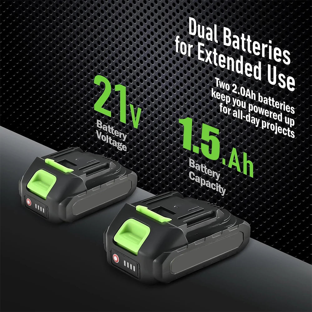 - Bateria: 2 x 21V 1.5Ah baterias recarregáveis
