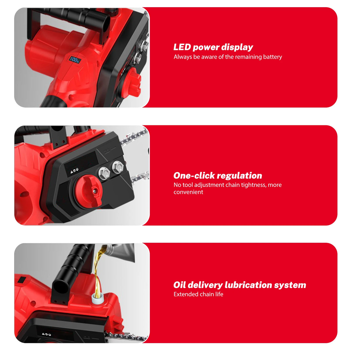 Projetada para uso no mundo real, esta motosserra sem fio combina alta eficiência, saída estável e baixo ruído para uma experiência de corte confiável. Oferece velocidade de corte rápida, desempenho prático e alta estabilidade, tornando-a uma ferramenta versátil para entusiastas de DIY e profissionais.