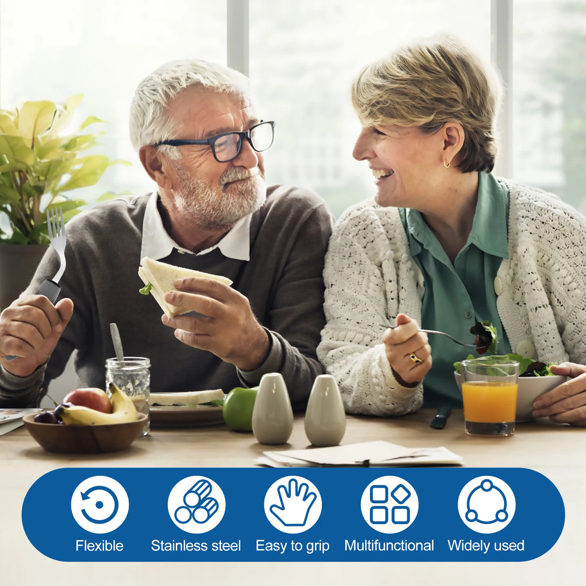 - Promove a independência: As lâminas anguladas e as tigelas maiores das colheres ajudam a colher, cortar e levar a comida à boca com menos esforço.