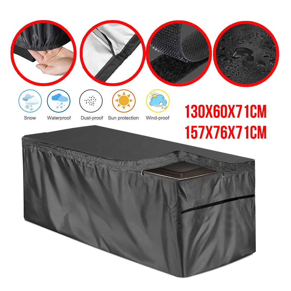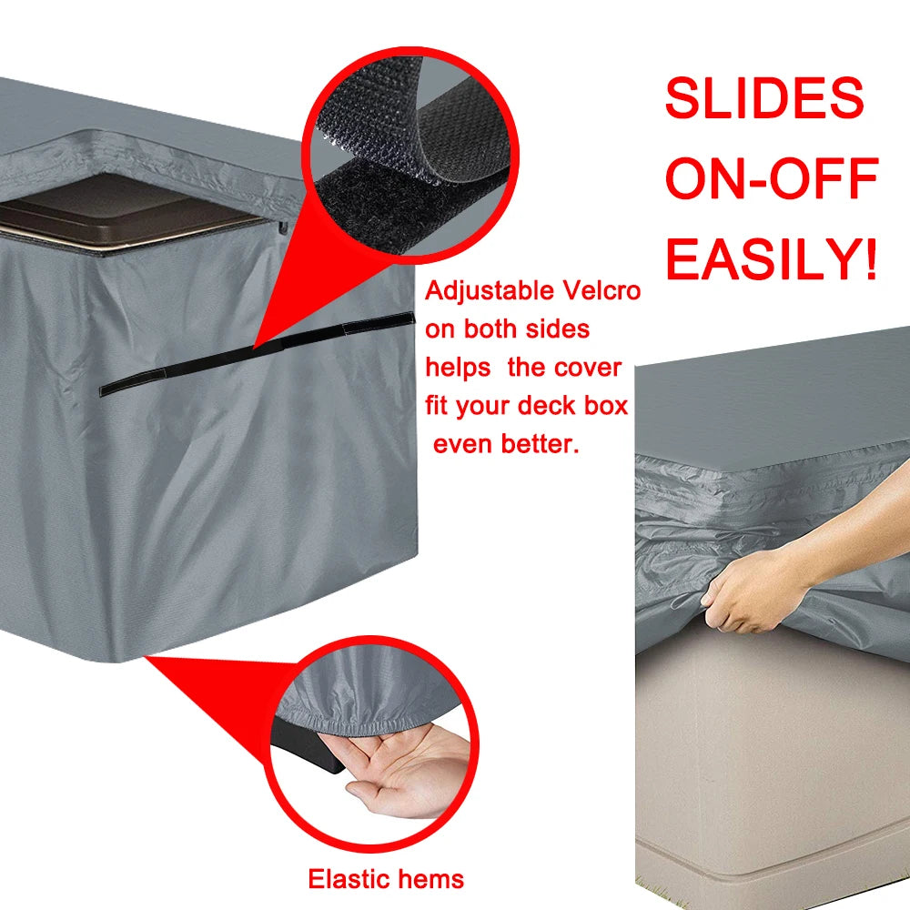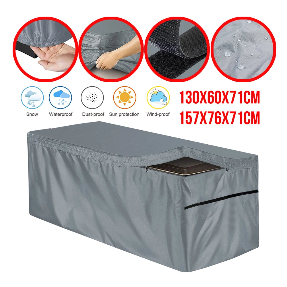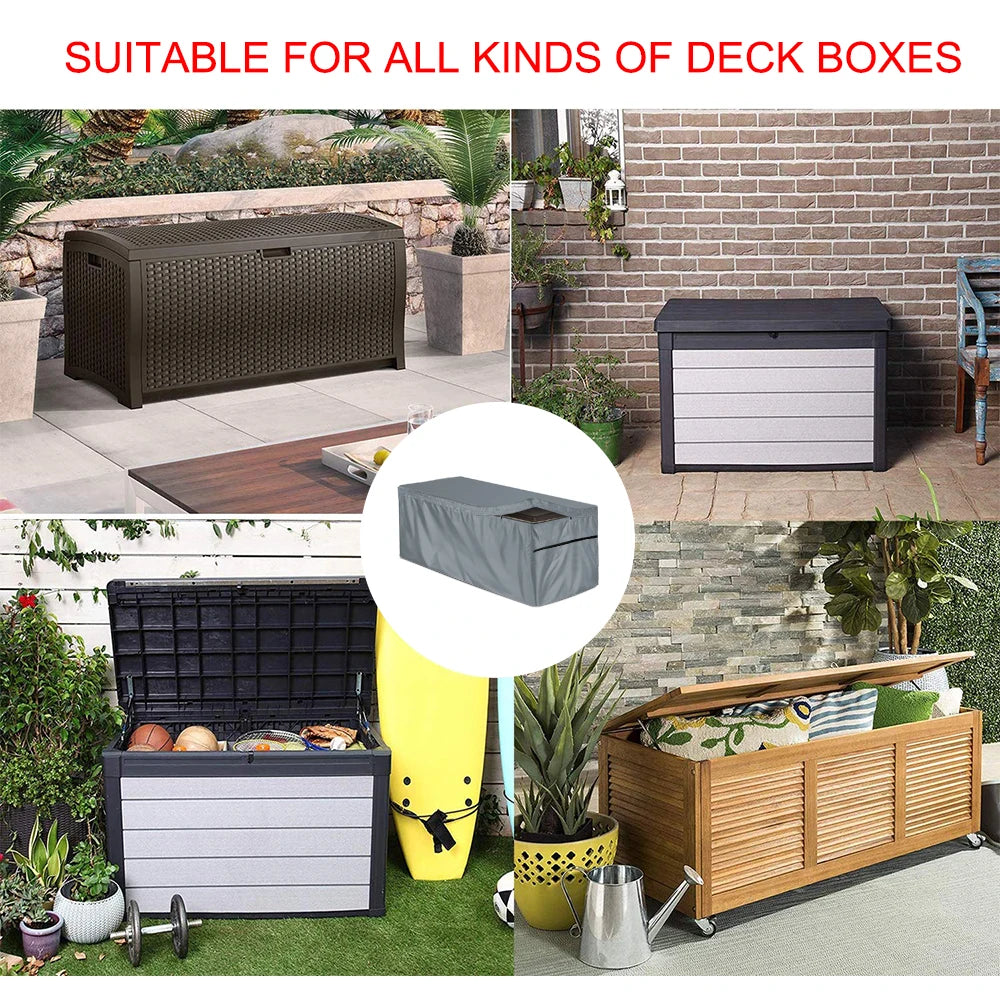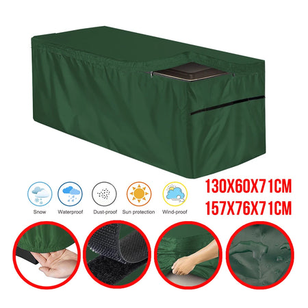 Capa para Caixa de Deck Exterior feita de tecido Oxford 210D durável, projetada para proteger caixas de deck retangulares da poeira, sol e chuva. Disponível em Preto, Cinza e Verde, esta capa vem em dois tamanhos práticos para se ajustar a caixas retangulares padrão: aproximadamente 130x60x71 cm e 157x76x71 cm.