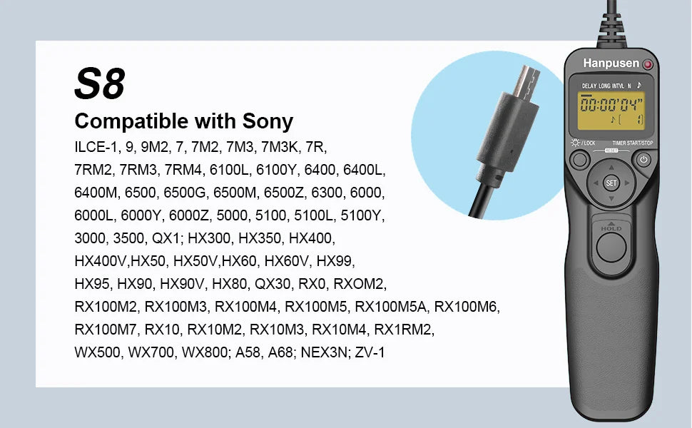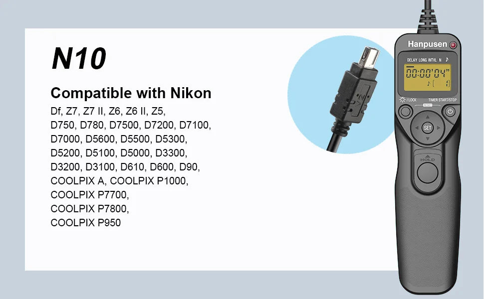 O controlo remoto para Time Lapse da câmara oferece controlo remoto com fio, suportando disparo único, disparo contínuo, disparo com atraso, disparo programado e disparo em intervalos. Compatível com uma ampla gama de marcas de câmaras, incluindo Canon, Nikon, Sony, Olympus, Fujifilm e Pentax.