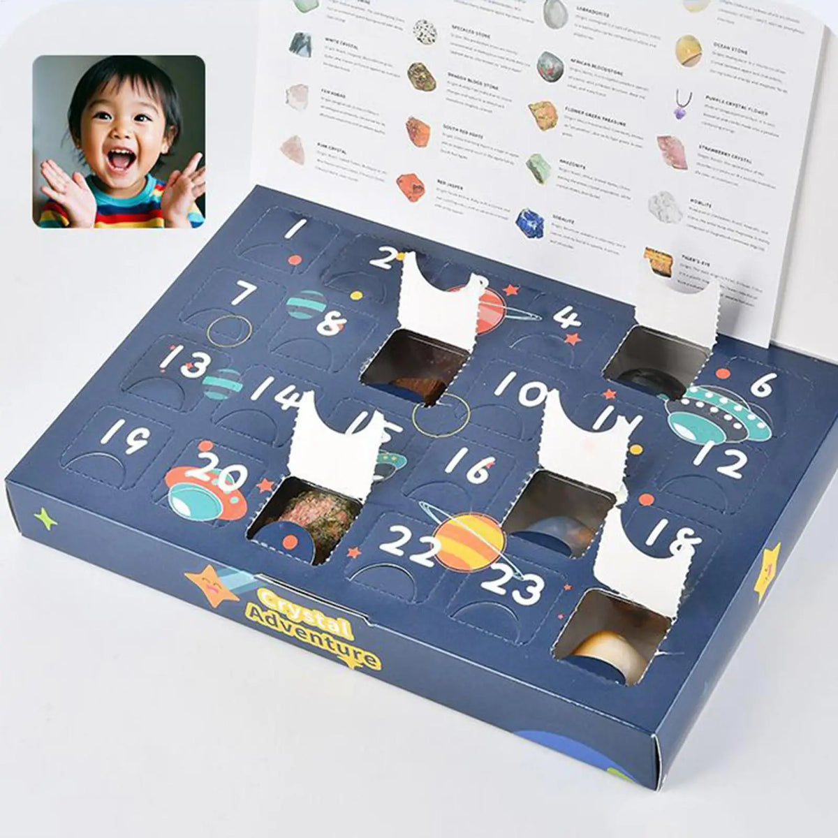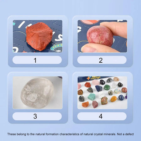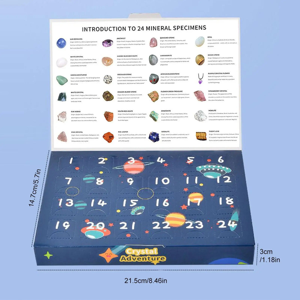 No interior, descobrirá 24 pedras preciosas naturais e espécimes minerais, cada um com cerca de 2–3 cm de tamanho, oferecendo uma experiência tátil e educativa. Juntamente com as pedras, encontrará cartões de introdução detalhados que explicam as características e a relevância cultural de cada gema, transformando uma simples contagem decrescente numa jornada de aprendizagem, num projeto de artesanato e numa coleção de recordações, tudo num só.