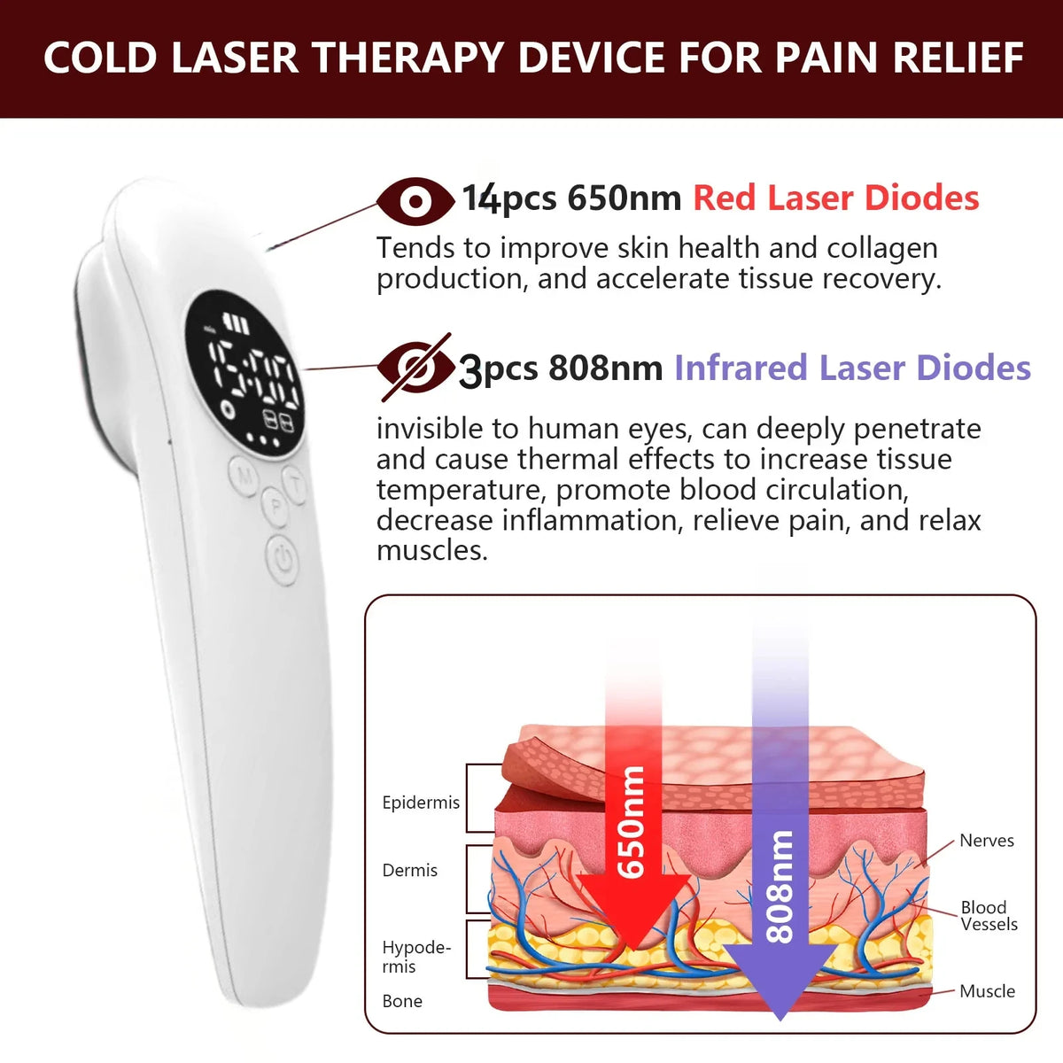 - Alívio direcionado para tecidos superficiais e profundos: use 650nm para lesões superficiais e 808nm para cura de tecidos mais profundos.