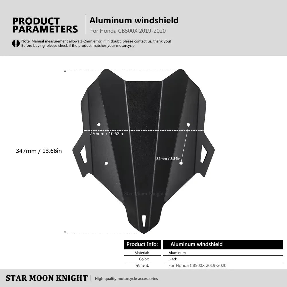 Melhore a sua experiência de condução com a Honda CB500X com este Defletor de Para-brisas em Alumínio, concebido especificamente para os modelos de 2019–2020. Fabricado em alumínio CNC e acabado em preto, este escudo para-brisas adapta-se às motos CB500X sem necessidade de modificações, proporcionando melhor aerodinâmica e conforto ao condutor. Tamanho máximo: A 340mm × L 328mm (±2–3mm). Inclui 1 para-brisas e parafusos de montagem.