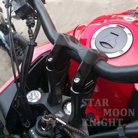 Eleve e reposicione o seu guiador com a Braçadeira Elevadora de Guiador Honda CB500X CB500F CB400X CB400F, Adaptador de Extensão em Alumínio CNC. Esta atualização usinada CNC adiciona 35 mm de elevação e aproxima o guiador 23 mm de si, proporcionando uma posição de condução mais confortável e ereta, ideal para touring, deslocações diárias e condução entusiasta.