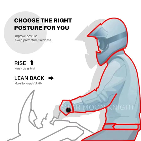 Com o deslocamento ergonómico, os condutores sentem menos tensão nas costas, pélvis, cóccix e braços—ajudando a conduzir por mais tempo com menos fadiga. A inclinação melhorada do guiador também aumenta o controlo e a precisão da direção, oferecendo uma sensação de condução mais direta sem sacrificar a manobrabilidade. O melhor de tudo é que a atualização não requer extensões nos cabos Bowden, preservando a resposta suave do acelerador e o desempenho fiável. Fácil de instalar e especificamente desenhado para os modelos listados abaixo, é a atualização prática para condutores que querem conforto e controlo num pacote compacto.