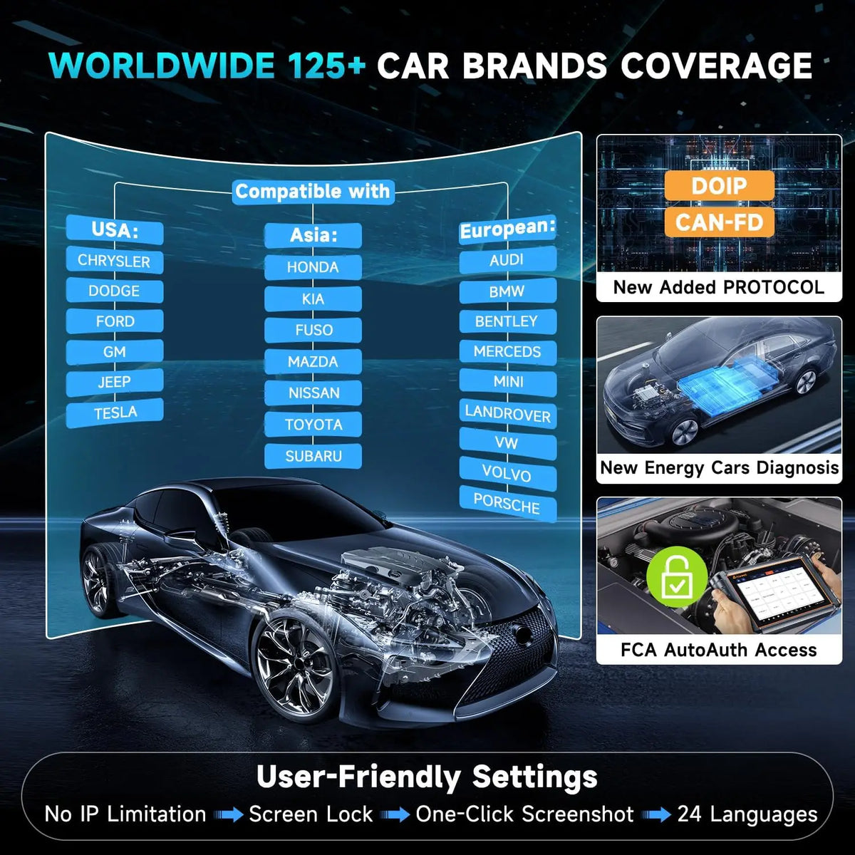 - Cobertura do Sistema: Diagnóstico de Todos os Sistemas; mais de 125 marcas de carros; mais de 20 idiomas; Versão Global (sem limite de IP)