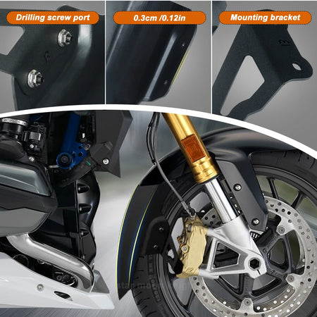 Melhore a sua BMW com as Extensões do Guarda-lamas Dianteiro BMW R1250R, Protetor contra Salpicos—uma atualização prática do guarda-lamas dianteiro concebida para proteger a sua moto contra salpicos, sujidade e pedras. Projetada para ampliar a cobertura sem alterar as linhas da moto, esta extensão de 25 cm segue o contorno do seu guarda-lamas dianteiro para um aspeto limpo e integrado. Fabricada em ABS com aço carbono, oferece proteção duradoura para componentes importantes como os coletores de escape, o motor inferior e o radiador, ajudando a reduzir danos causados por pedras em passeios difíceis. Fornecida com suportes cortados a laser e todos os fixadores necessários, foi concebida para uma instalação segura e simples nas BMW R1200R (2015-2018) e BMW R1250R (2019-). Todos os equipamentos eletrónicos e mecânicos, dispositivos e máquinas vendidos pela InterCyprus para países da UE são certificados CE e têm uma garantia de dois anos.