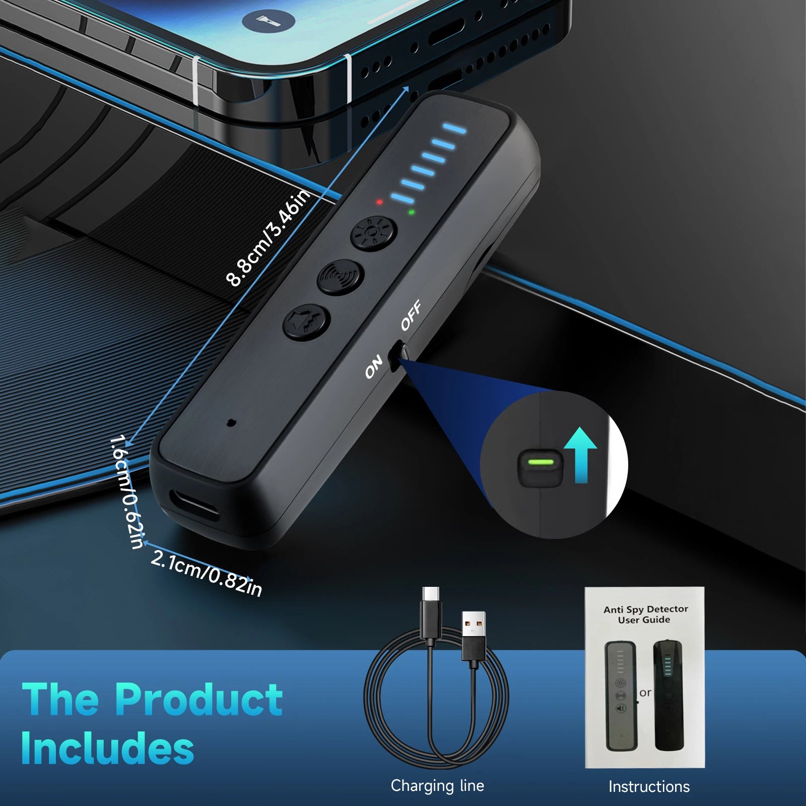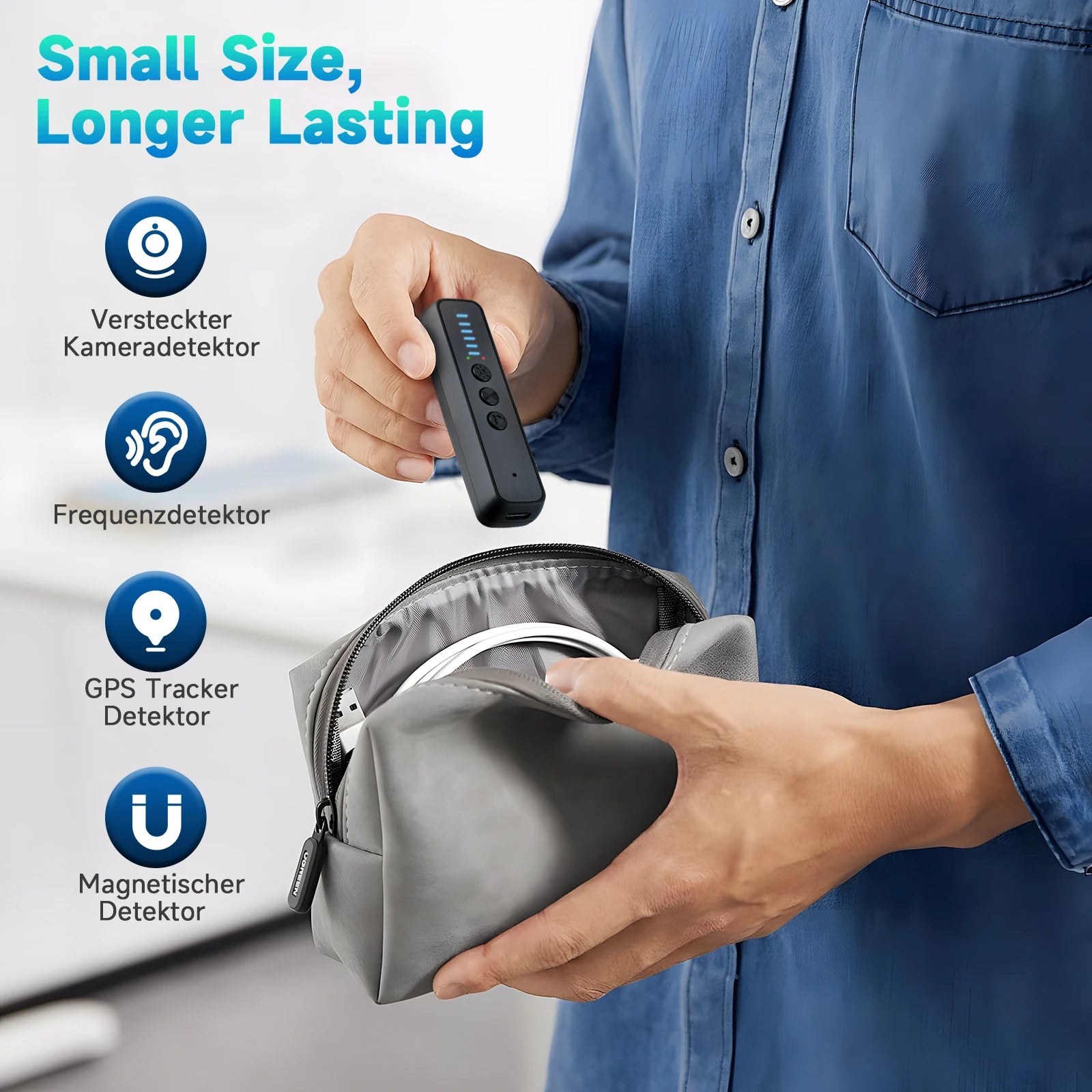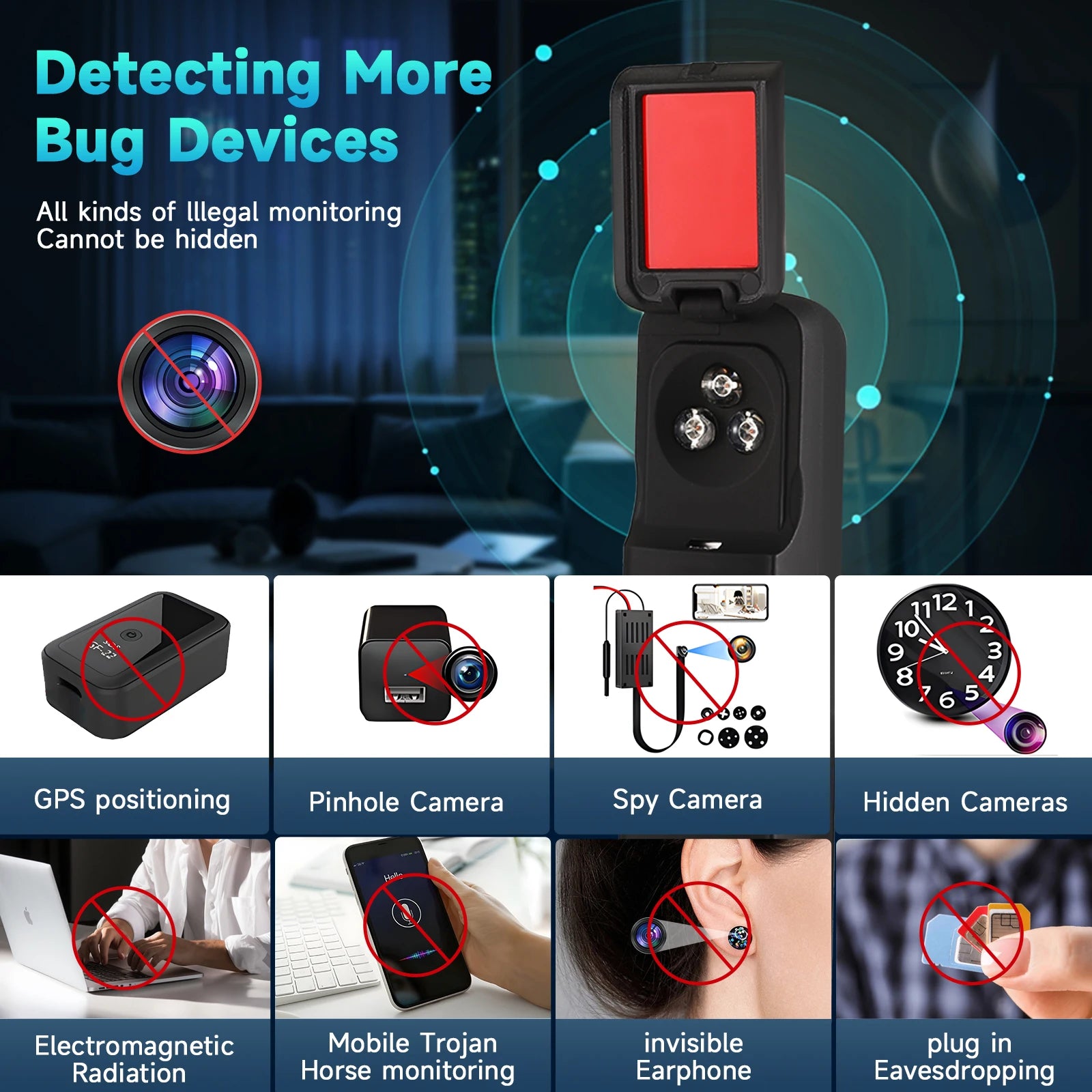 - Capacidades de deteção: deteção de sinais RF (câmeras ocultas WiFi, rastreadores GPS, dispositivos de escuta sem fios); deteção de banda completa 100 MHz–8 GHz; deteção por varredura a laser; deteção de campo magnético forte para rastreadores GPS magnetizados