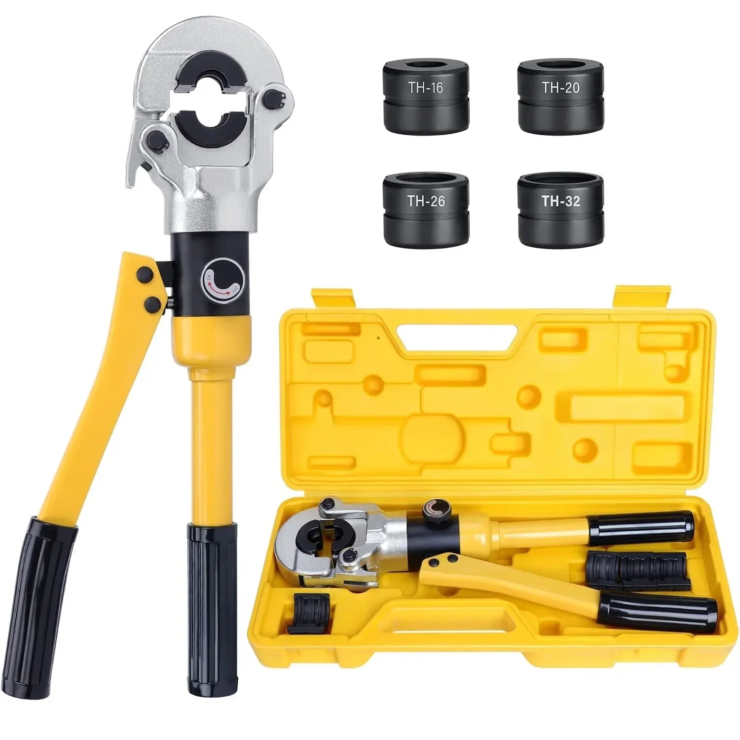Ferramenta Hidráulica de Crimpagem TH16 20 26 32mm Cabeça Rotativa 16T é uma alicate hidráulico versátil para crimpagem de tubos, concebido para conexões rápidas e sem fugas em cobre, alumínio e vários tubos plásticos, incluindo PEX e PB. Apresenta uma cabeça rotativa de 360° e quatro inserções de contorno TH (TH16, TH20, TH26, TH32) para pressionar tubos de 16–32 mm com facilidade, tornando-a ideal para aquecimento, água quente, água fria, água potável, aquecimento por piso radiante e instalações solares.
