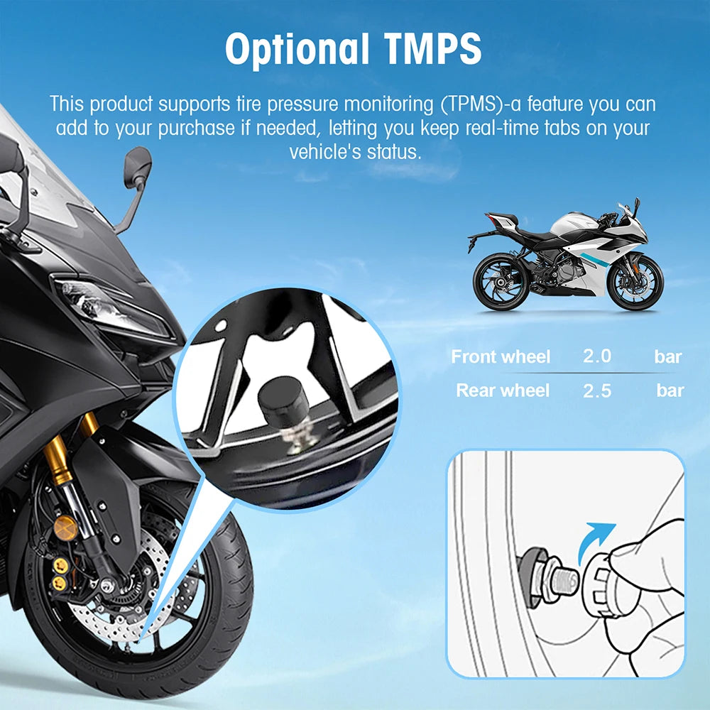 Projetado para funcionar em condições difíceis, o seu design à prova d'água IP67 permite que ande com confiança na chuva ou spray, e até durante uma lavagem, sem medo de danos causados pela água. O Arranque Rápido significa que está pronto para navegar em cerca de 3 segundos, mantendo-o em movimento. A separação de áudio e vídeo facilita a conexão a auriculares Bluetooth ou altifalantes de motocicleta para direções claras e som imersivo. A unidade é compatível com uma variedade de modelos e suporta acessórios opcionais, como monitores de pressão dos pneus e um gravador para viagens mais inteligentes e seguras. É aplicável a motocicletas, bicicletas elétricas, ATVs e muito mais.