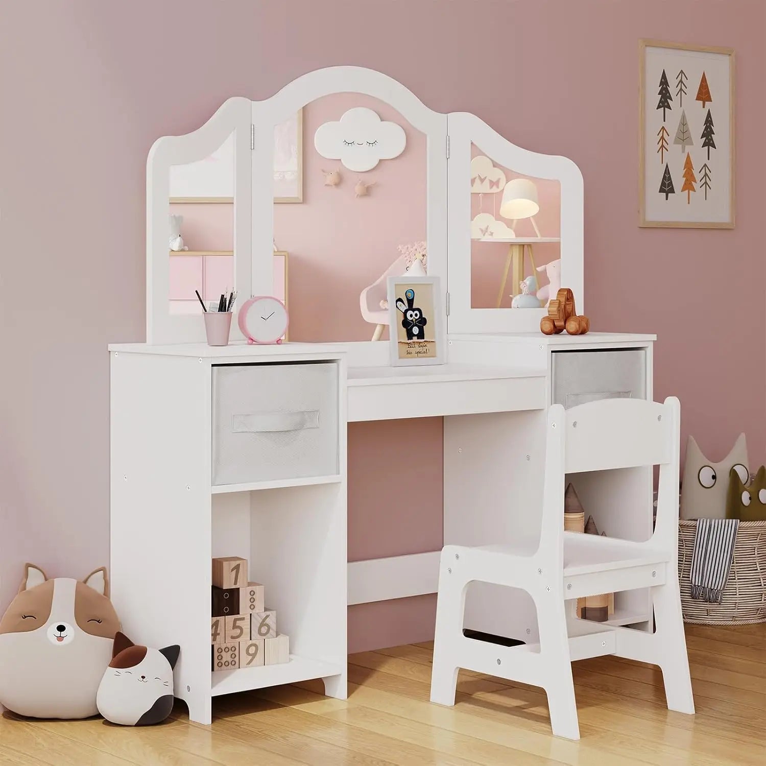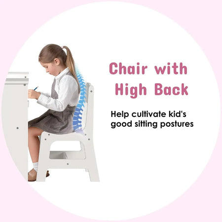 Entre num mundo de brincadeira com o Conjunto de Penteadeira Infantil — Mesa e Cadeira de Maquilhagem de Princesa com Espelho. Fabricado em MDF durável e acabado em rosa e branco, este conjunto encantador oferece aos pequenos designers um espaço dedicado para brincar a vestir, praticar maquilhagem e organizar os seus tesouros. O espelho acrílico é resistente a estilhaços (mais seguro para brincadeiras ativas), e a cadeira tem cantos arredondados para reduzir pancadas durante manhãs agitadas ou sessões criativas. O espelho triplo ajustável a 180° permite às crianças ver o seu visual de todos os ângulos, inspirando criatividade e confiança enquanto se vestem para o dia.