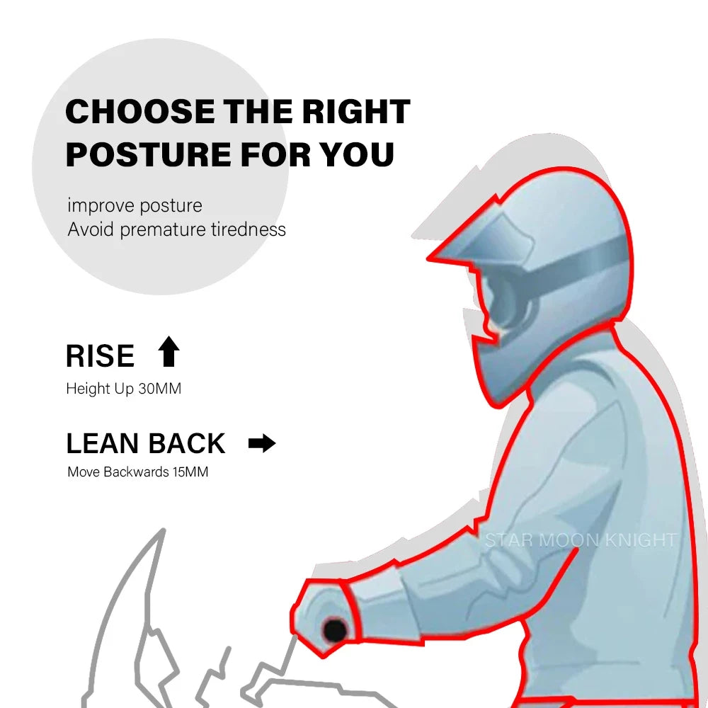 Concebido para melhorar a ergonomia sem comprometer o controlo, o elevador aumenta a altura em 30mm enquanto move o guiador 15mm para trás. O resultado é uma posição de assento mais relaxada, manobrabilidade aprimorada e uma sensação de direção mais precisa e direta. O acabamento anodizado prateado adiciona uma estética premium que complementa o estilo da moto. A instalação é simples e não são necessárias extensões dos cabos Bowden, mantendo o conjunto limpo e responsivo.