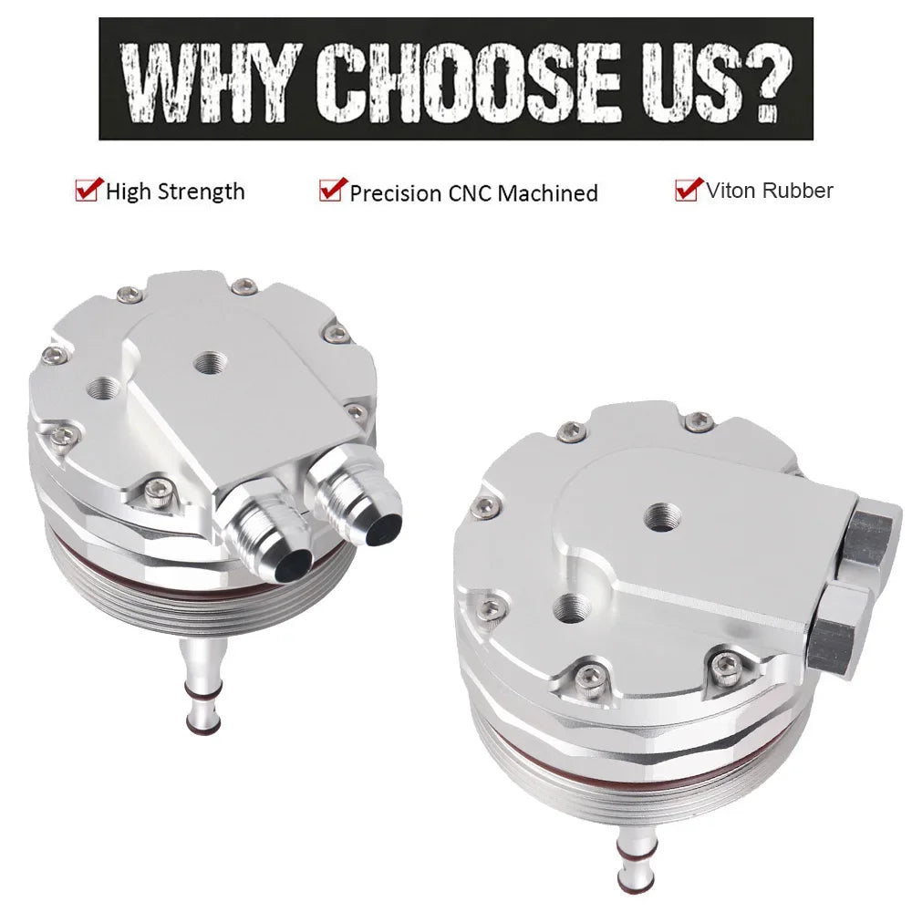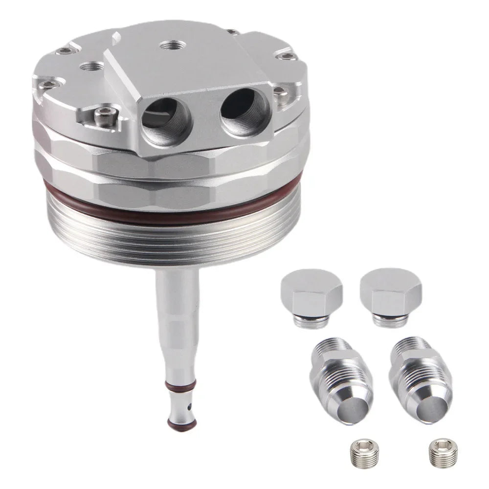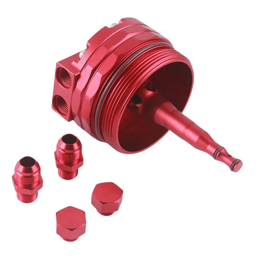 - 1 x Tampa de filtro de óleo em alumínio com encaixes AN10 e 2 portas de sensor