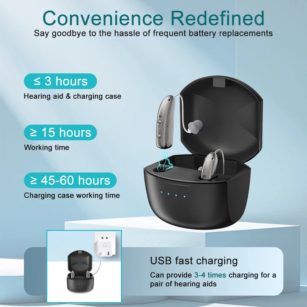 Apito auditivo digital Bluetooth recarregável para surdez, amplificador de som portátil para idosos da Laiwen foi concebido para ajudar aqueles com perda auditiva ligeira a moderada a desfrutar de conversas e sons diários com amplificação mais clara e natural. O design compacto atrás da orelha assenta discretamente atrás da orelha, enquanto as pontas de silicone macias proporcionam um ajuste confortável e seguro. Com redução de ruído melhorada e processamento de 10 canais, este dispositivo minimiza o ruído de fundo para ajudar a concentrar-se na fala. Com uma bateria recarregável, nunca precisa de substituir as pilhas, e a caixa de carregamento prolonga o tempo de audição para longos dias fora de casa. A conectividade Bluetooth adiciona emparelhamento conveniente com o seu telemóvel ou outros dispositivos, e o ajuste com um clique permite-lhe personalizar o som rapidamente em qualquer situação. Este aparelho auditivo é ideal para uso diário em casa, no trabalho ou enquanto está fora, ajudando-o a manter-se envolvido em conversas e atividades com menos interrupções do ruído ambiente.