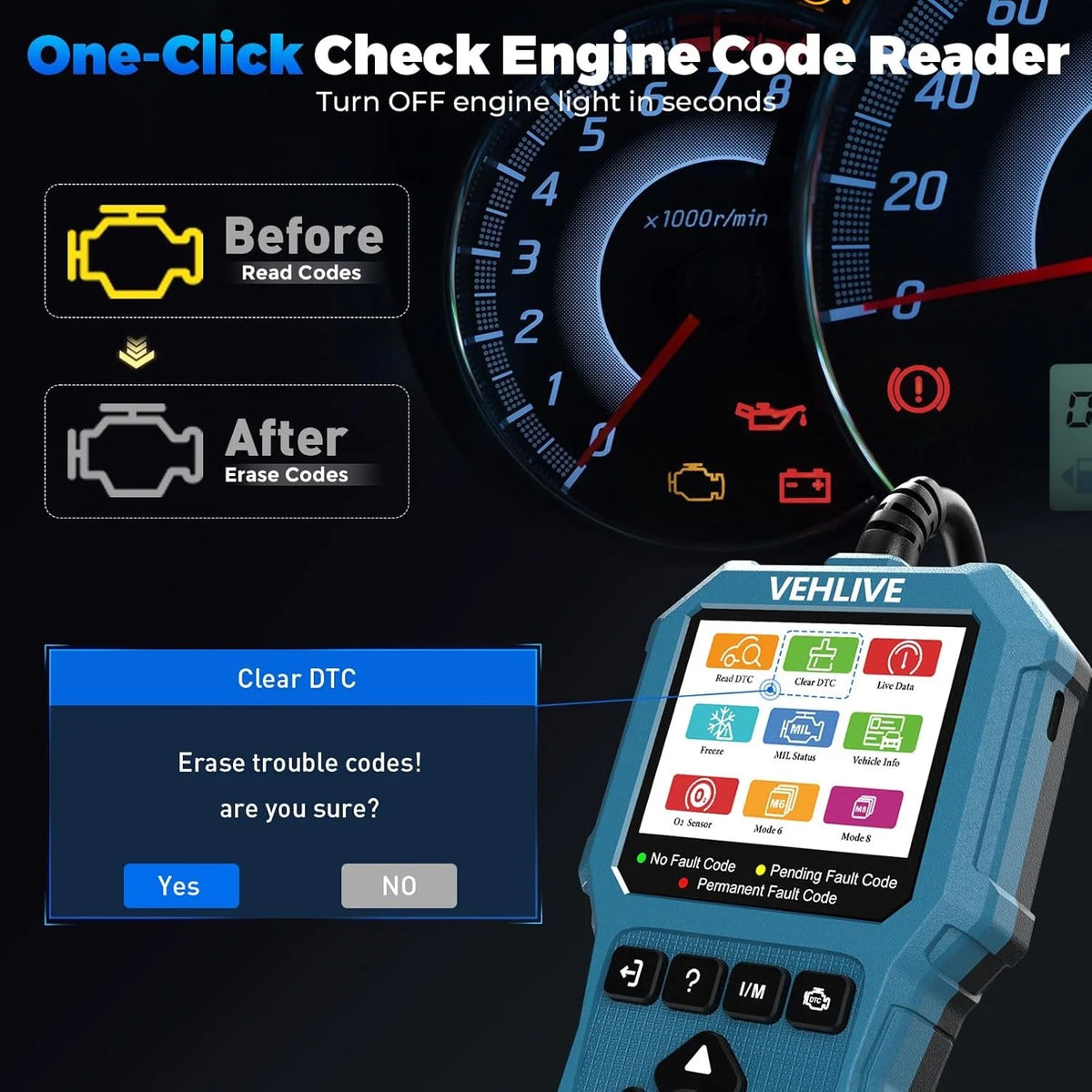 - Use one-click I/M readiness to quickly verify whether your vehicle complies with emission-related readiness before passing a smog test or a road inspection.