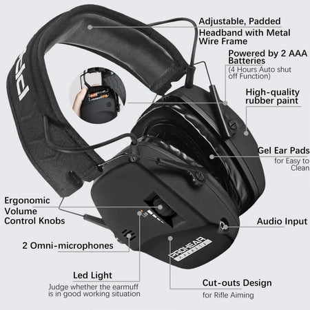 Conheça os PROHEAR Electronic Hunting Ear Muffs com almofadas de gel — a escolha principal para proteção auditiva duradoura sem dores de cabeça. Projetados com os inovadores Selos Auriculares de Gel GEP02 da PROHEAR, estes protetores distribuem a pressão de forma mais uniforme para manter o conforto durante sessões prolongadas de tiro, caça, mineração, construção ou atividades ao ar livre. O resultado é uma vedação confortável, compatível com óculos, que bloqueia ruídos nocivos enquanto o mantém atento ao ambiente.