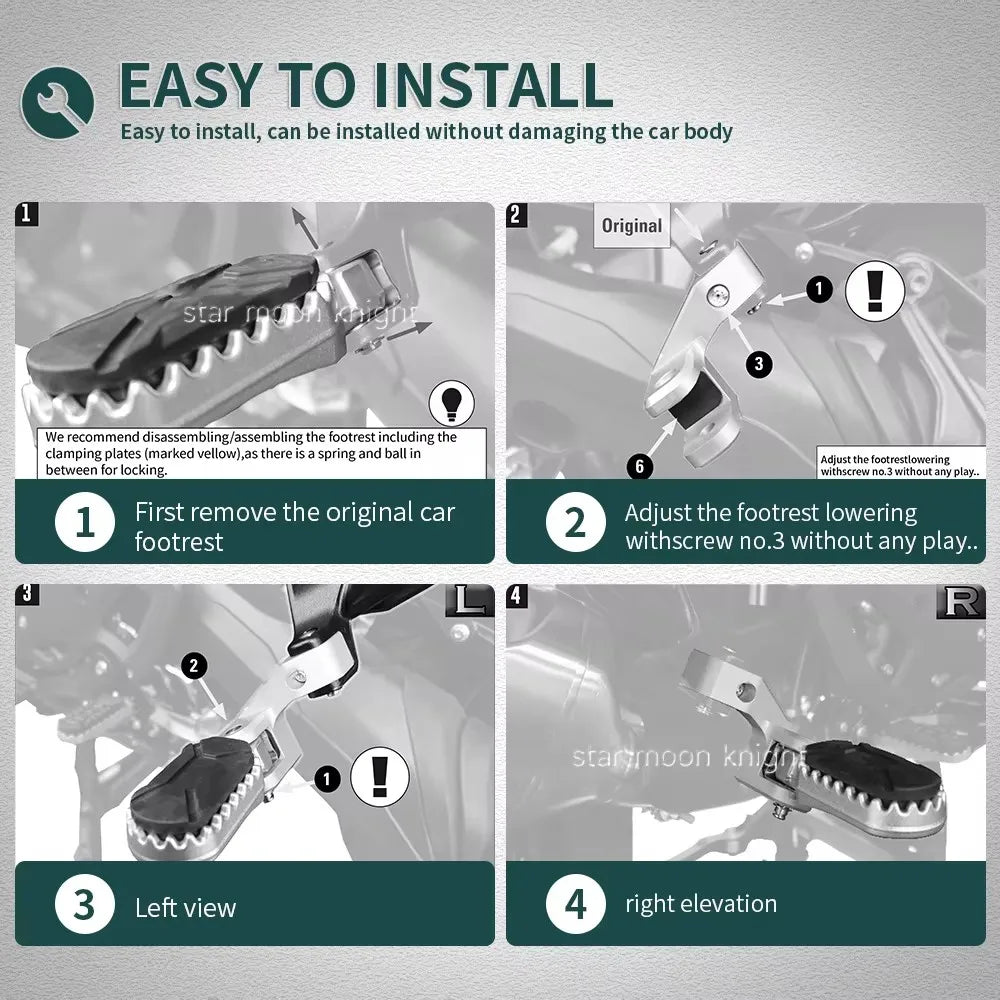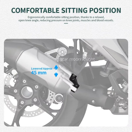 Melhore a sua condução com o Kit de Rebaixamento do Descanso de Pés para Passageiro BMW R 1300 GS, um suporte de alumínio precisamente concebido especificamente para a R1300GS 2024. Ao rebaixar os descansos de pés do passageiro em aproximadamente 45 mm, este kit abre o ângulo do joelho, proporcionando uma posição de assento visivelmente mais confortável e relaxada — perfeito para cruzeiros de longa distância. O design ergonómico ajuda a reduzir a tensão nos joelhos, músculos e vasos sanguíneos, permitindo uma condução sem fadiga e agradável em viagens prolongadas. Também facilita que o passageiro da frente se sente direito, contribuindo para experiências no banco traseiro mais seguras e confortáveis. Tudo isto mantendo a compatibilidade total: os casos do sistema e outros acessórios ainda encaixam sem restrições. O kit completo instala-se no suporte de retenção padrão com uma configuração simples, para que possa desfrutar de maior conforto com o mínimo de complicações. Fabricado em alumínio de alta qualidade e acabado com um revestimento anodizado preto e prateado durável para resistência duradoura e um aspeto premium. Compatível com BMW R1300GS (2024-). 100% novo, peso cerca de 0,36 kg, e dimensionado para manuseamento e instalação simples. Fabricado na China Continental pela Star Moon Knight.