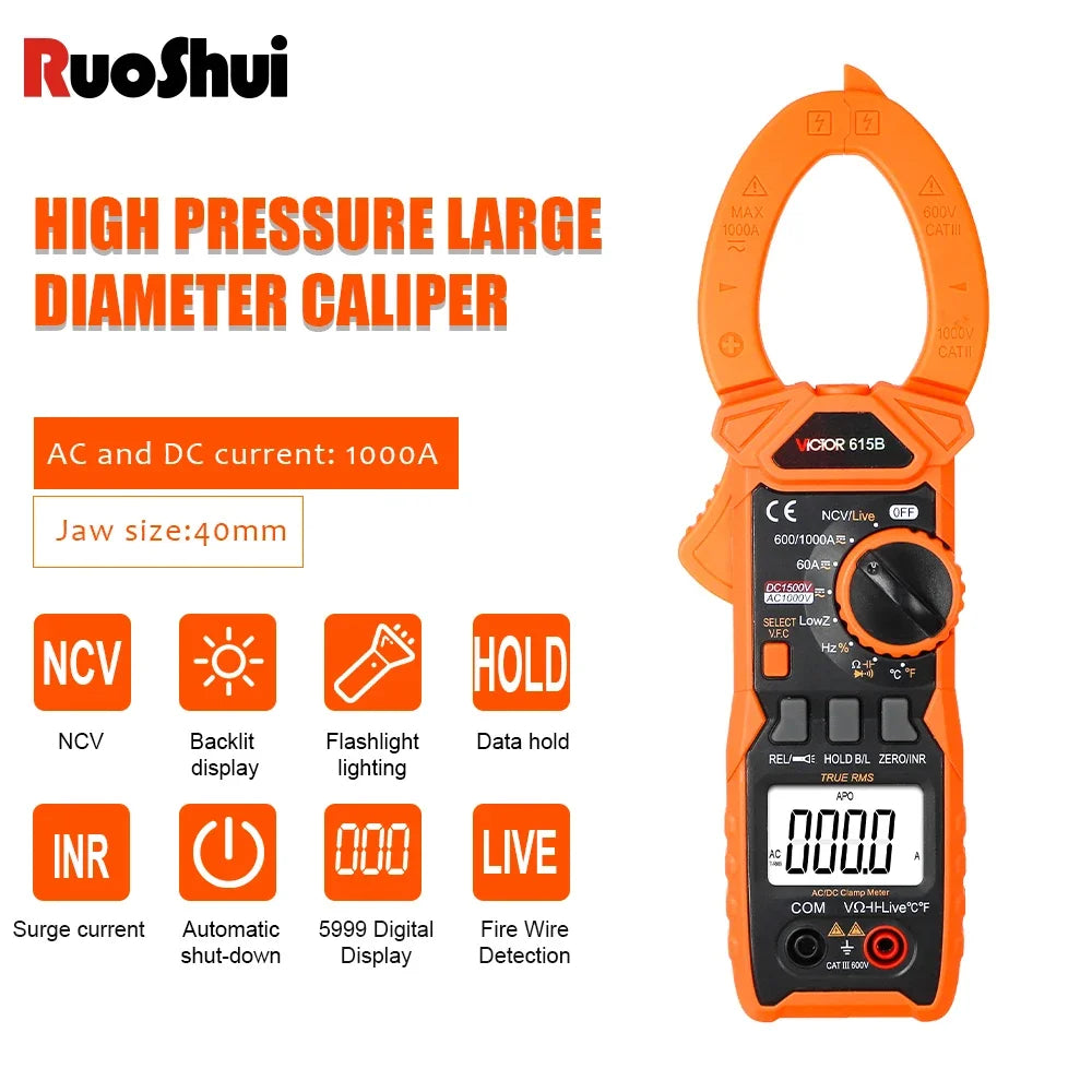 Multímetro de Garra Digital Ruoshui 615B 1500V NCV Medidor de Ohmios
