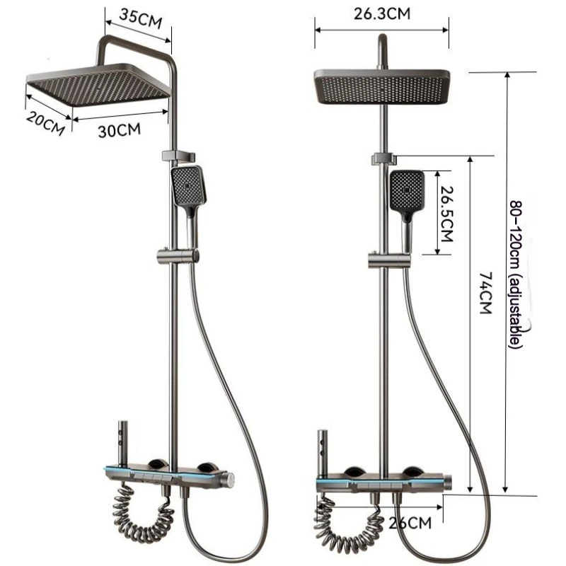 O chuveiro superior pode ser ajustado universalmente, o suporte do chuveiro manual pode ajustar a altura e o ângulo de inclinação, o que é adequado para as necessidades de diferentes utilizadores.