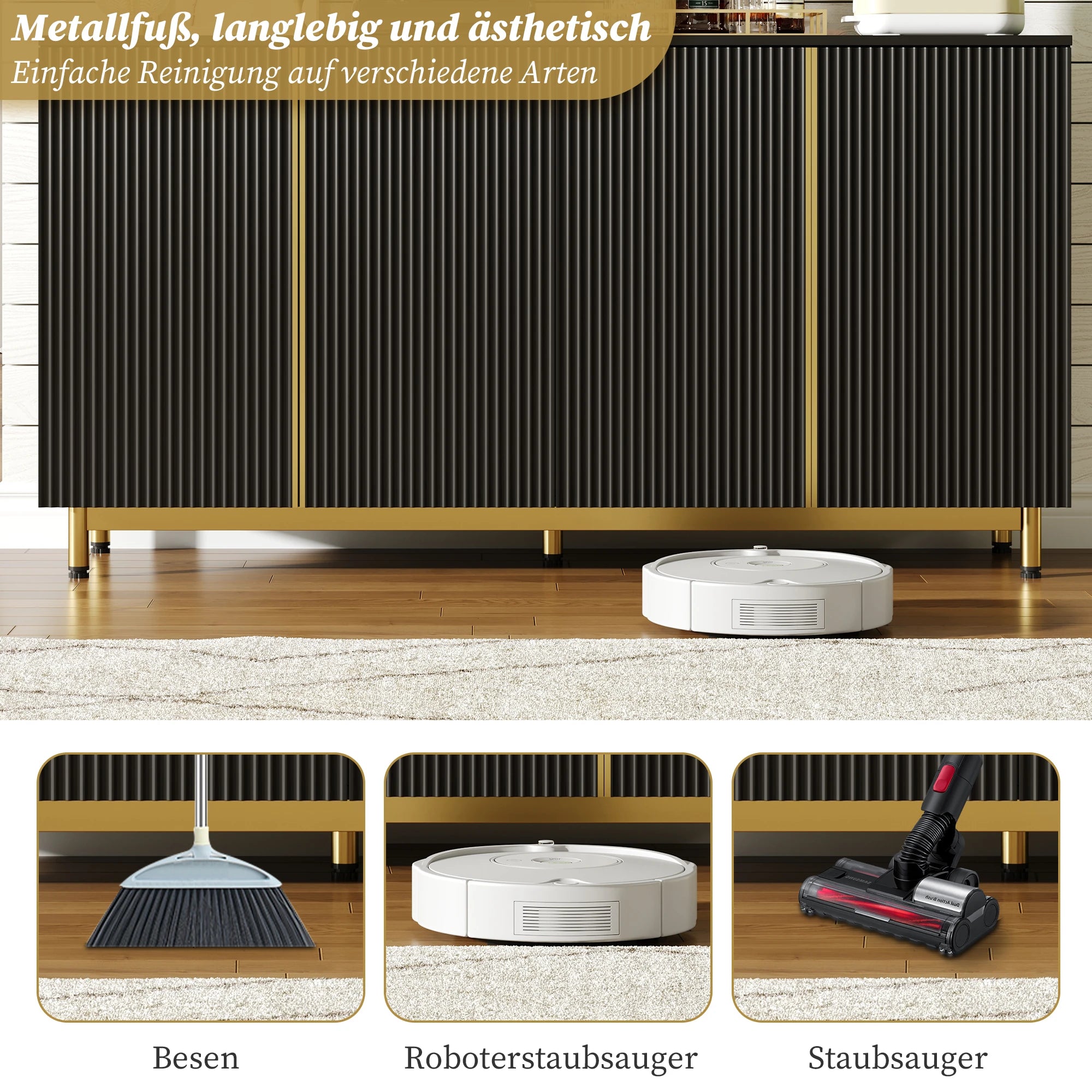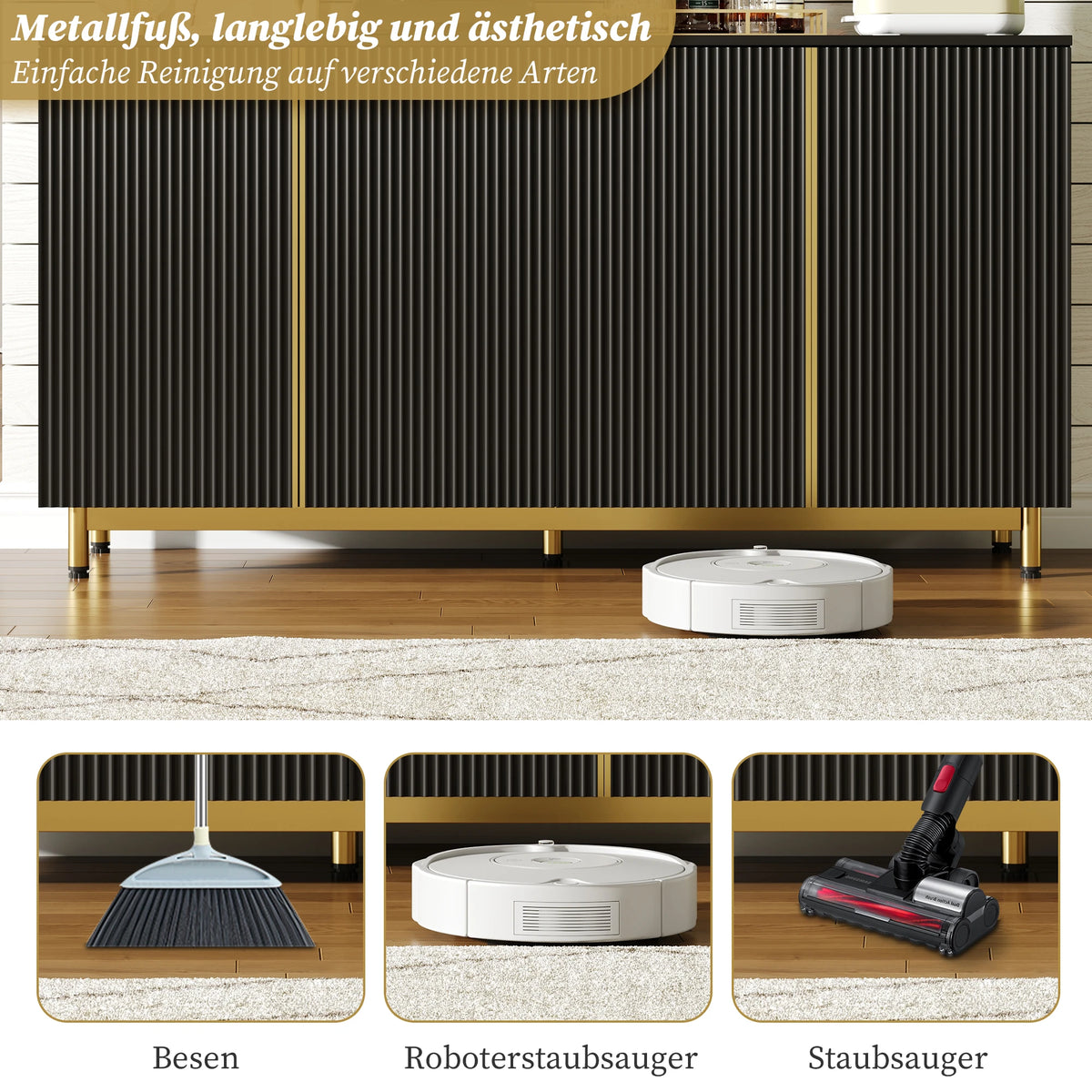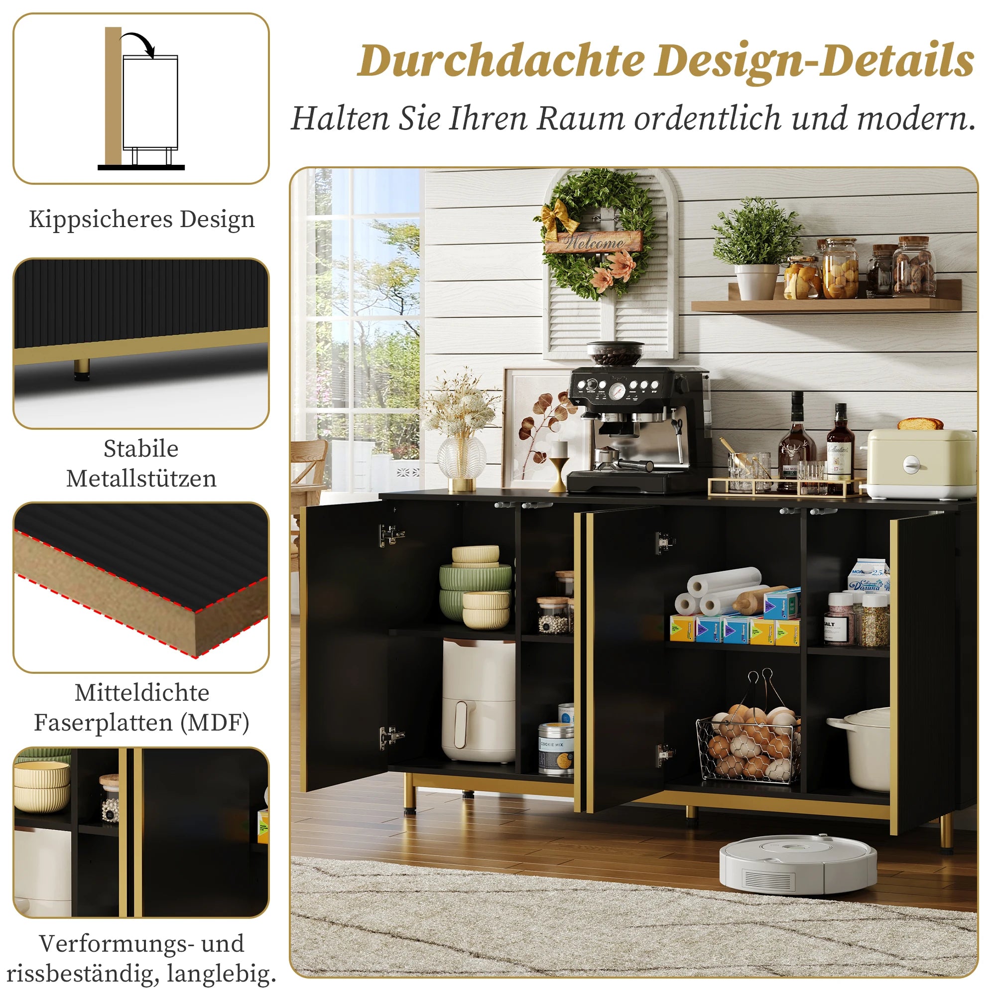 Conheça o Aparador 150cm com Portas Onduladas e Pés Ajustáveis — uma solução de armazenamento espaçosa e elegante, concebida para simplificar a sua casa. Construído em madeira engenheirada com uma base metálica robusta, este aparador combina durabilidade com um aspeto moderno e limpo. As portas onduladas sem puxadores oferecem um visual elegante, enquanto o mecanismo de fecho automático ajuda a evitar batidas acidentais. Com 4 portas e 4 prateleiras ajustáveis, pode personalizar o armazenamento para louça, pequenos eletrodomésticos ou acessórios multimédia. A superfície superior suporta até 50 kg, e cada prateleira suporta até 10 kg, tornando-o ideal para uso diário e para receber convidados. Elevado 11 cm do chão, é fácil de aspirar e manter limpo, e um dispositivo anti-tombamento oferece segurança extra para casas com crianças ou animais de estimação.